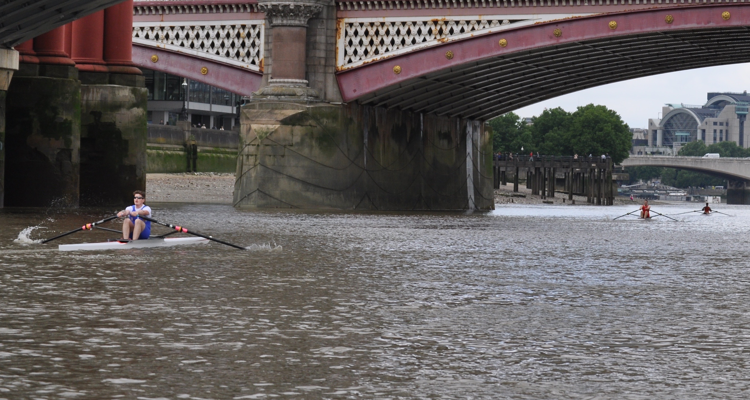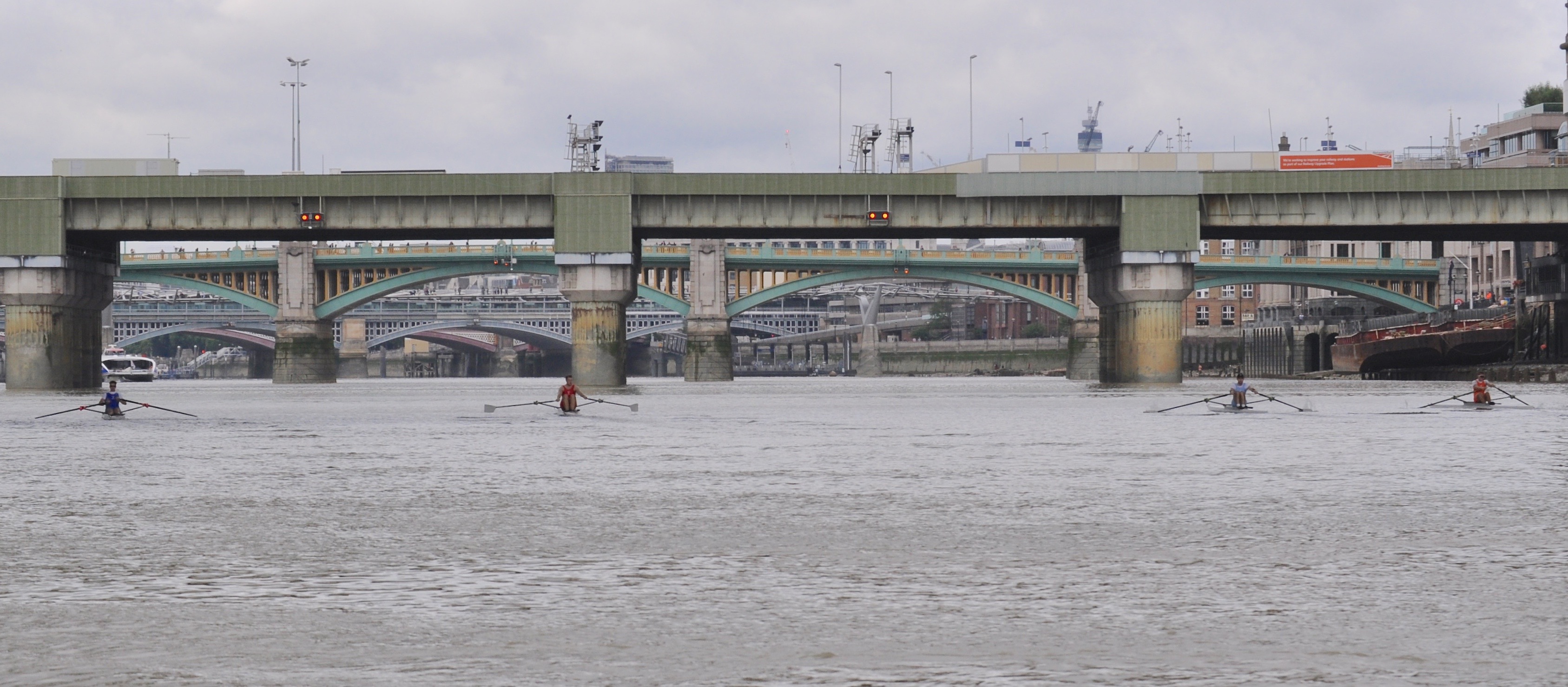 A mere 250m in looms the Cannon Street rail bridge, and already the pattern of the race was set. Keech led, sculling powerfully and favouring the water slightly off-centre, while Anderson followed in second, Flynn dropped back rapidly on the southern shore and McCarthy was ploughing a lone furrow mid-stream but staying slightly ahead of Flynn. Before they reached the Millennium footbridge it was obvious that the race was Keech’s to lose. While Anderson used the tide well and doggedly forged on in second, Keech’s superior technique moved him effortlessly away with every stroke, and Flynn and McCarthy were considerably less confident by comparison with the two lead scullers.