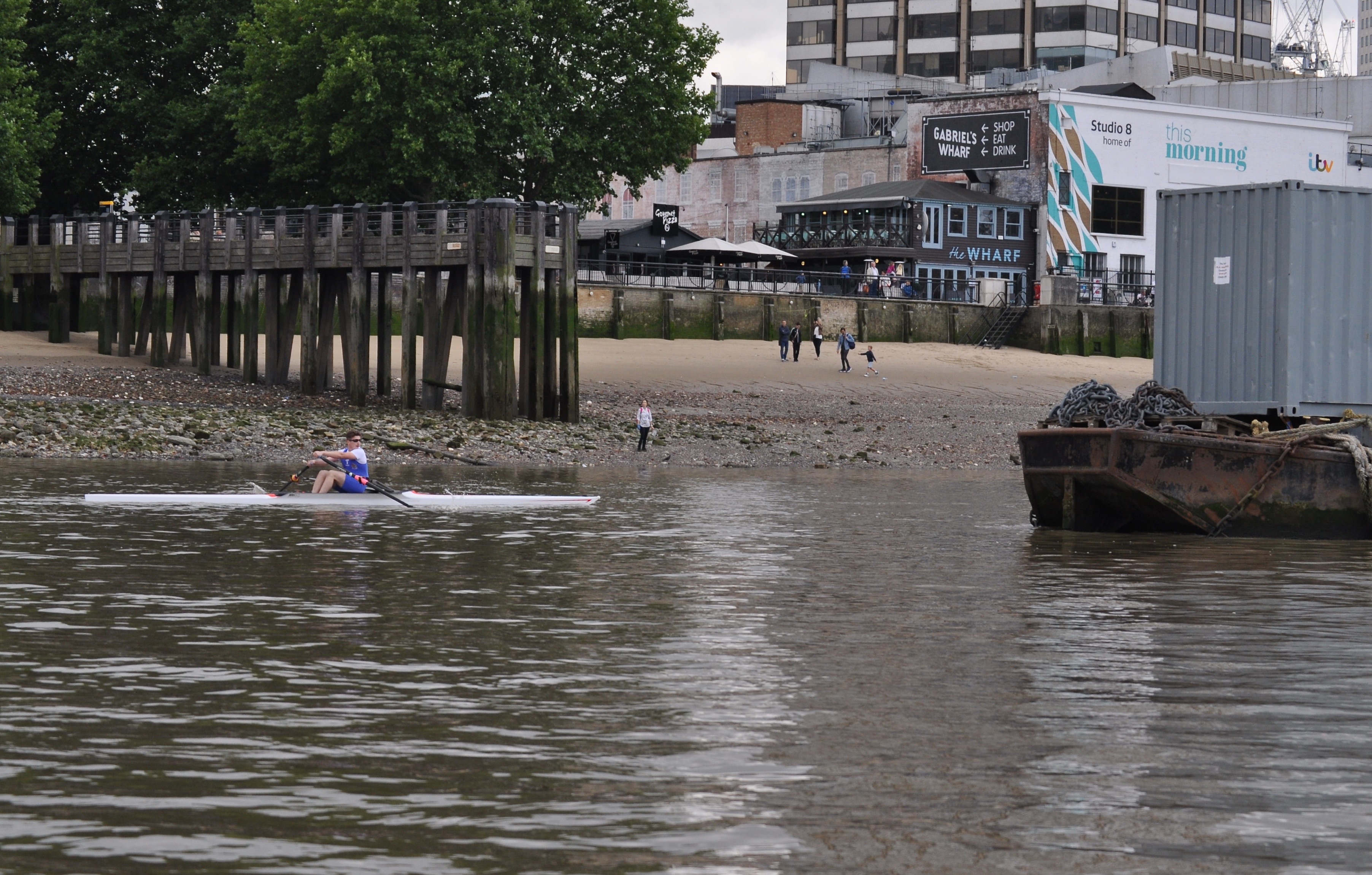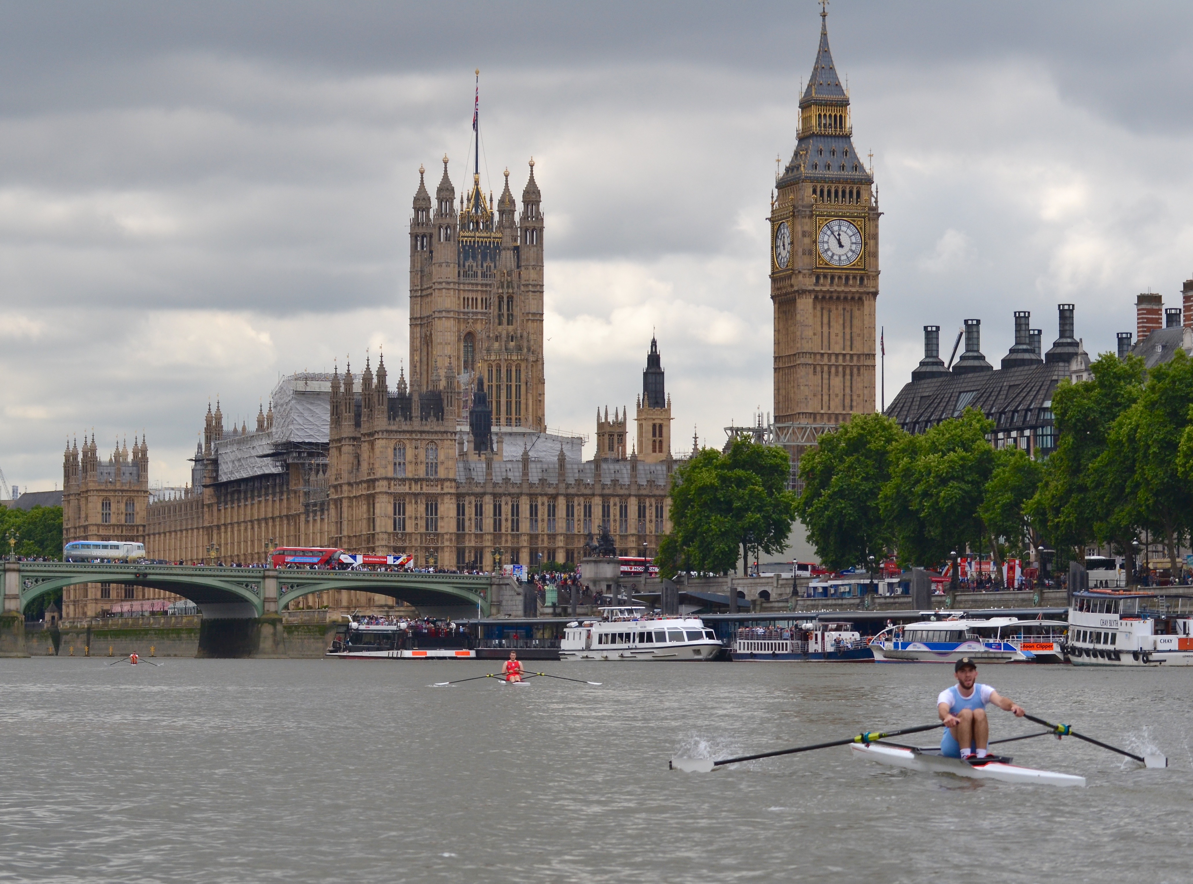 On reaching Lambeth Keech dropped his rate again, again cut the corners on the lethargic stream, but kept up a steady smooth stroke, economical and fluid. The umpire’s boat had passed Flynn by Waterloo Bridge, McCarthy after Vauxhall Bridge, and Anderson at Battersea Power Station, leaving Keech a solo coronation row to the finish line, followed only by the press and umpire’s launches along with the TV catamaran, as he sculled his way into the history books.