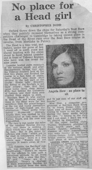 The Head of River Race crashed into the headlines in 1974 when the race commentator opined that Barclays Bank II, chomping past the Putney boathouses toward the finish, was steered by a woman. The bank was duly disqualified while this Guardian reporter took 21-year-old computer programmer Angela How for an exclusive photo shoot in a booth up Putney High Street. Under the Head’s Amateur Rowing Association rules there was nothing specifying that coxes must be men, but the notes for officials to be read in conjunction with the rules of racing said ‘women may not compete in men’s crews or vice-versa’.