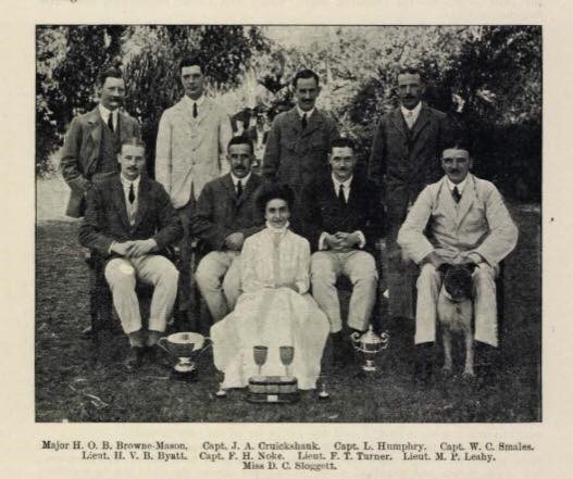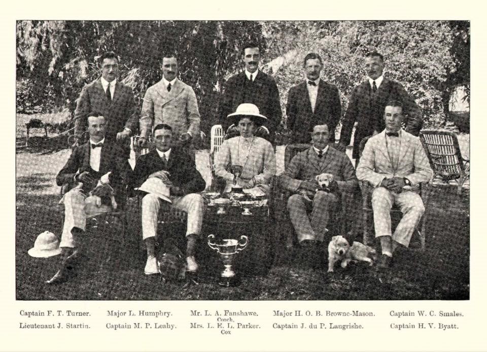 Seated beside Mrs L. E. L. Parker are Captain M. P. Leahy and Captain J. du P. Langrishe, two of the Trinity College, Dublin crew that won the Thames Cup in 1903 at Henley. On HTBS, we are used to seeing a pooch or two in rowing photos but four together is a first for me. Mrs Parker coxed both the R.A.M.C. junior four that lost to the Gunners by a length and the senior eight, ably stroked by Langrishe with Leahy directly behind him, that won the Station Eights final: