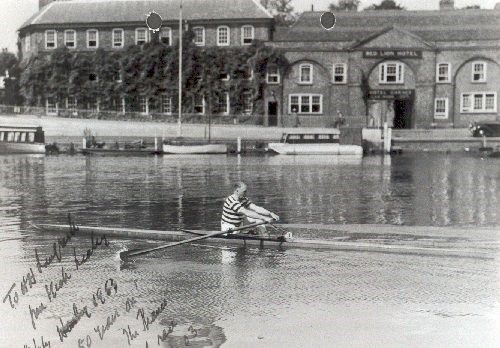 In 1953, Mick Leahy returned to Henley and sculled the course to commemorate his participation in the D.U.B.C. victory in the Ladies’ Plate 50 years before. What is not readily noticeable from the above photograph is that Leahy has less that the average number of legs (c.1.999). If you look closely, you will see a left leg but no right one. According to Blake ‘he had the misfortune to lose a leg in the war, but his enthusiasm for the sport was undimmed, and he managed to row for Leander after his injury.’ By this time J. du P. Langrishe had died but Leahy kindly sent this photograph to H. H. Langrishe, Jack’s elder brother, who had graduated from Trinity College in 1893.
