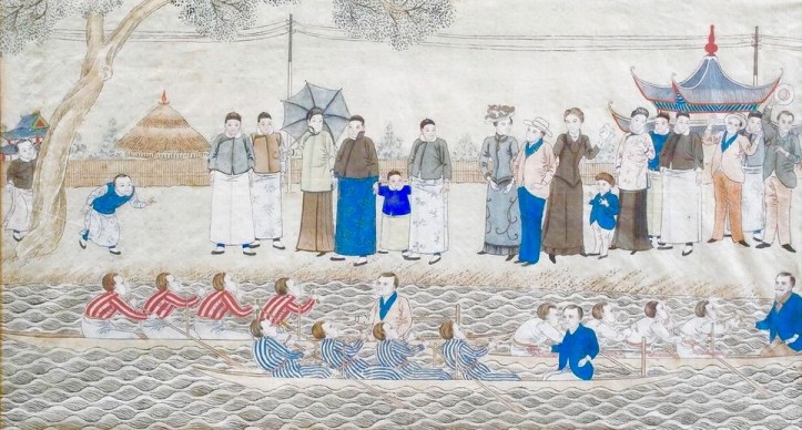 A Chinese silk painting of 1905 depicting Europeans rowing in Shanghai, a port on the Yangtze River Delta on the East China coast. This picture, together with another depicting horse racing, is for sale. The dealer in Chicago says it dates to a period ‘when Chinese artists began using traditional art forms to illustrate Western traditions – a departure from the traditional subjects of nature and landscape. These paintings illustrate how recreation came to be part Shanghai’s colonial history… The Chinese architecture stands behind finely painted electrical wires which were certainly very new at the time’.