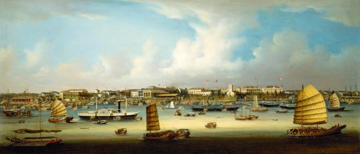 ‘The Shanghai Regatta with a View of The Bund’, c.1850, Chinese School. This is part of a larger picture. The boat with the American flag holds the umpire. The Bund was a promenade along the Huangpu River, home to many foreign banks and business houses. Picture: Creative Commons Licence / Peabody Essex Museum 2006 / Mark Sexton Photo.