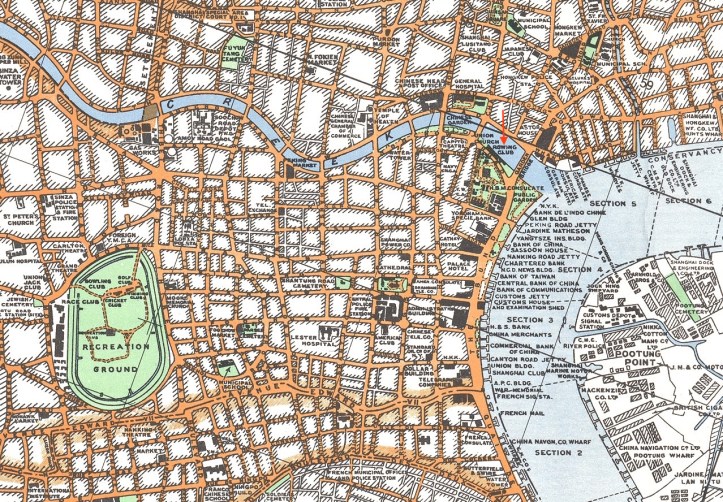 This partial map of Shanghai in 1935 (click to enlarge) shows how the British and other foreigners had created a sporting and social ‘home from home’. The rowing club, sited on the Suzhou (‘Soo-chow’) Creek near where it flows into the Huangpu (‘Whang-poo’) River is shown by the red arrow. On the recreation ground on the left are marked the cricket, golf, bowling and swimming clubs. The horse racing track of the Race Club ran around the ground. A remarkable list of clubs and associations in Shanghai in 1939 is here.