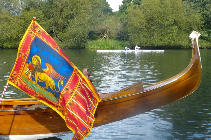 In the background is the six-oared shallop, Royal Thamesis, which is rowed conventionally on fixed seats. City Barge looks after the craft on behalf of the Drapers’ Guild. This is through another connection formed by Richard Norton.