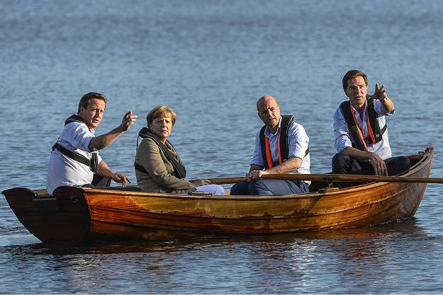 Four prime ministers in the same boat, from left: David Cameron (Great Britain), Angela Merkel (Germany), Fredrik Reinfeldt (Sweden) and Mark Rutte (The Netherlands). Merkel and Rutte are still in power.