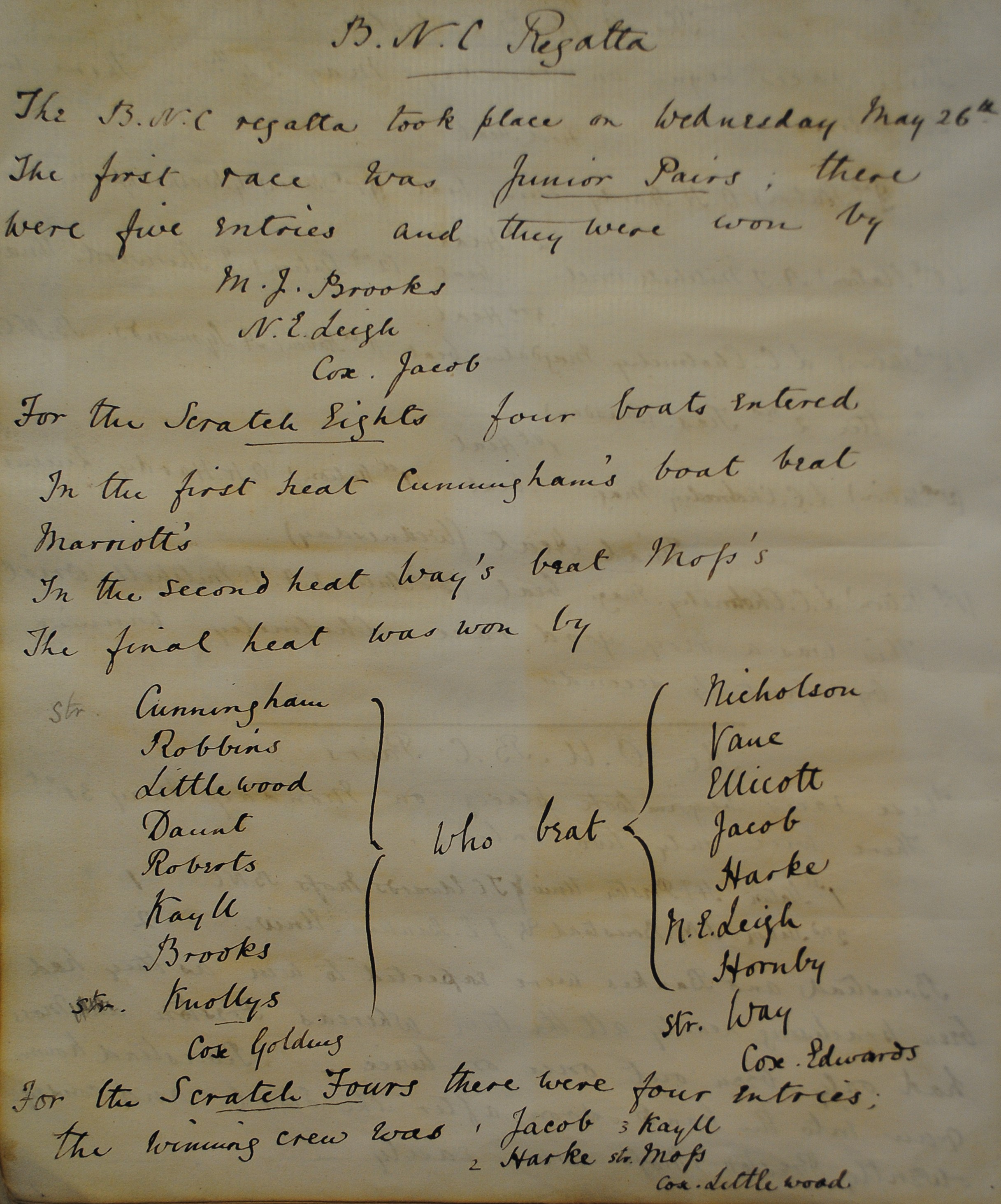 A page from the Boat Club Minute Book shows there were sufficient men to provide four crews for the Scratch Eights race, which was eventually won by a crew stroked by Knollys, who triumphed over a crew stroked by J.P. Way.