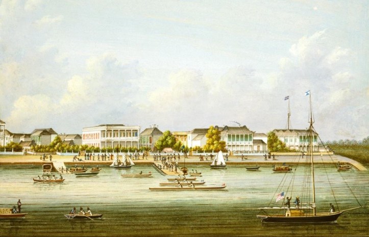 I was very pleased to have found some splendid pictures to illustrate my Shanghai posts, notably a detail from a picture of 1850 in the Peabody Essex Museum in Salem, Massachusetts, titled “The Shanghai Regatta with a View of the Bund”. The Bund was a promenade along Shanghai’s Huangpu River, home to many foreign banks and business houses, later famous for its classic Art Deco buildings of the 1920s and 1930s.