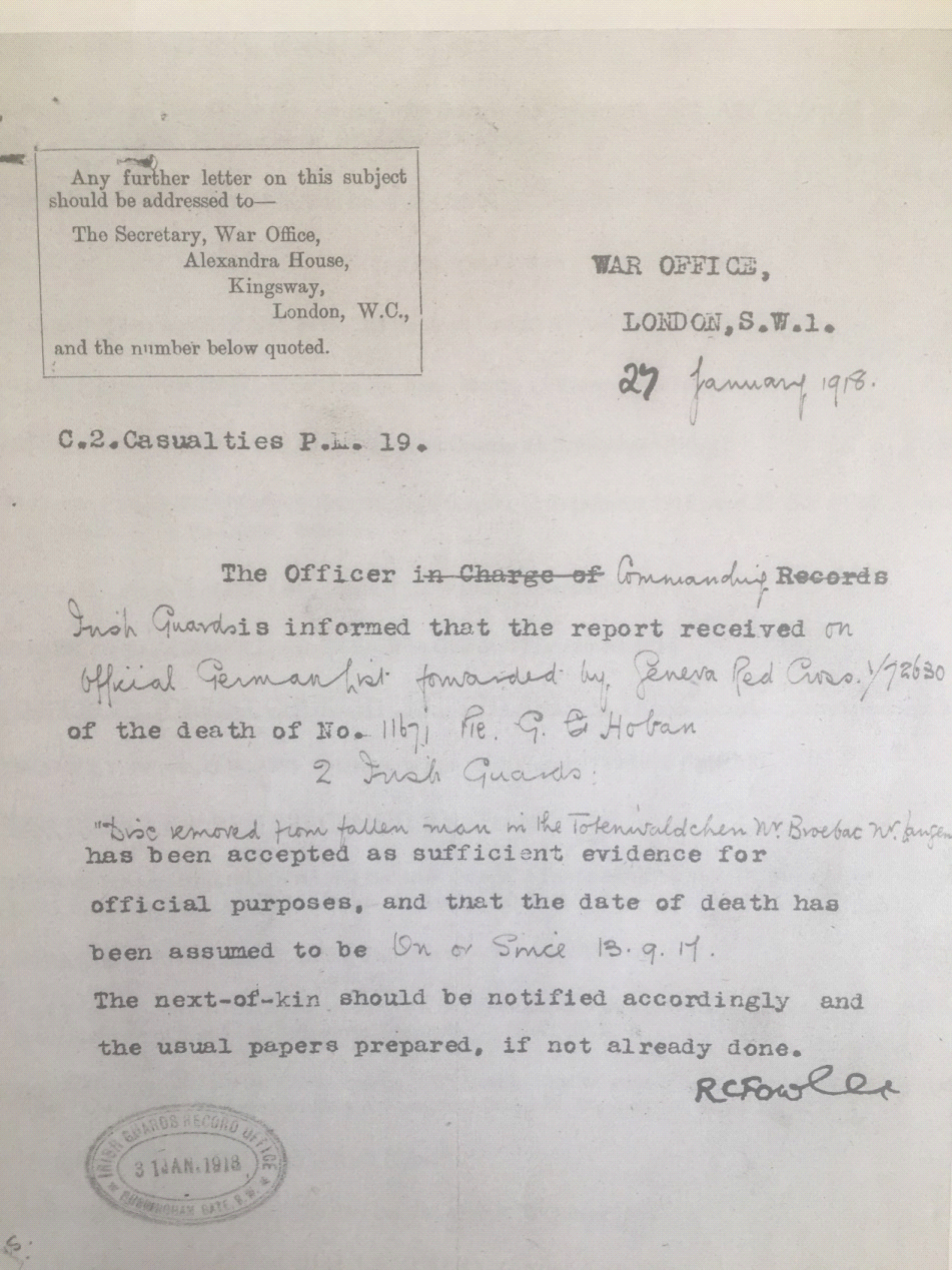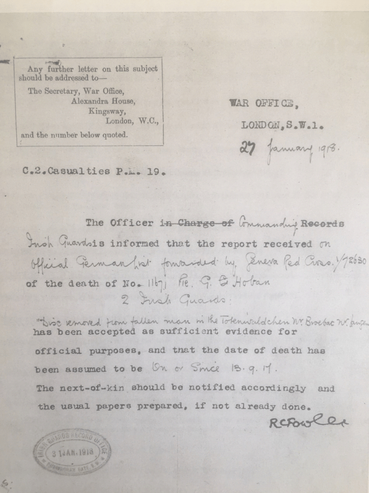 In the envelope sent by the archivist were photocopies of everything that they had recorded for Private Gregory Hoban. Included was a copy of a letter from the War Office dated 27 January 1918 which confirmed the news that everyone was expecting since Greg had gone missing, four months earlier, on 13 September 1917.