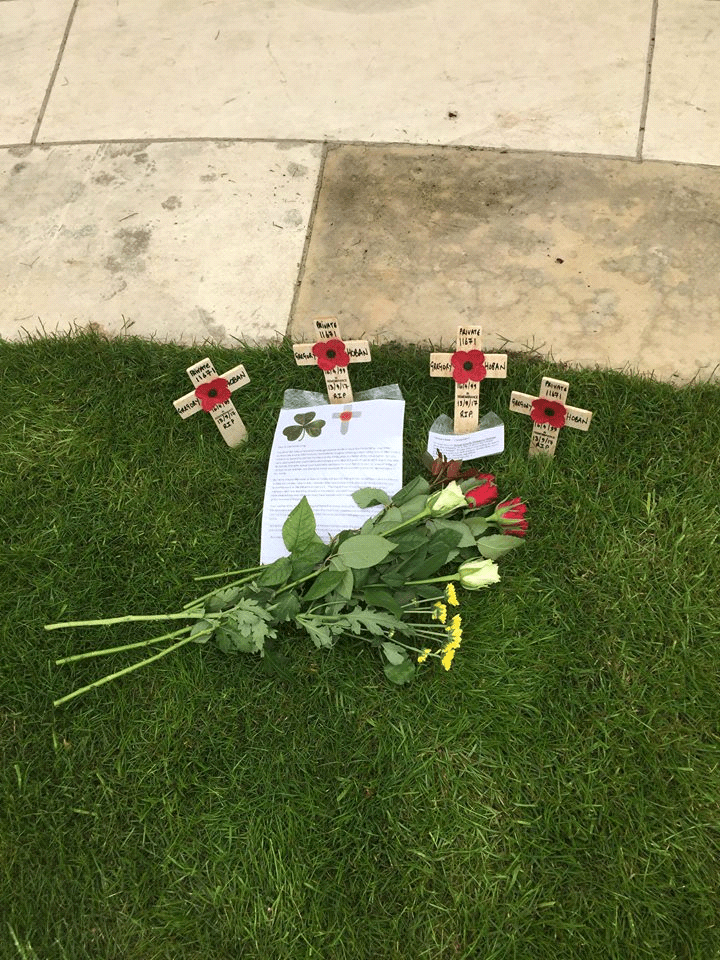 Mick found Greg’s name on the Tyne Cot Memorial and paid his respects by leaving his own memorial consisting of four wooden crosses and two notes sent by his sister and cousin.