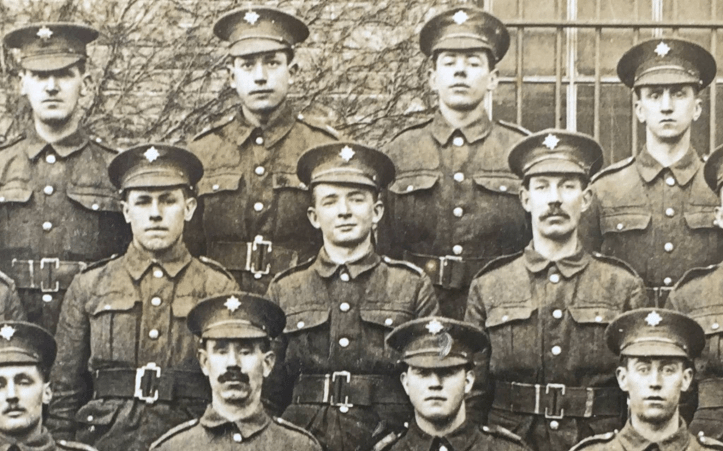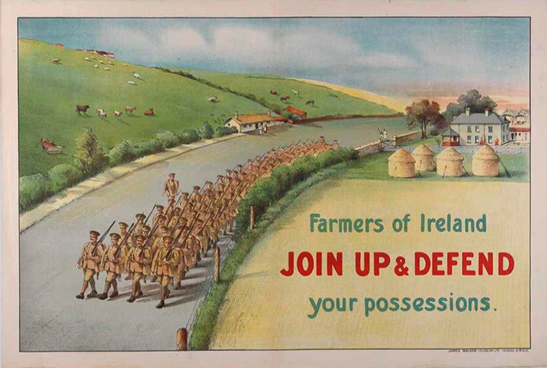 As I have mentioned before in HTBS articles, there was no conscription in Ireland. Young Irish men still joined up by their thousands: for the adventure, for the money, to avenge the Lusitania, to avenge Little Belgium, to escape their small town. Recruitment Sergeants worked hard to fill the ranks and posters targeted every walk of life. You didn’t have to be a natural soldier to feel the pull: a relative home on leave having a quite word about the pleasures behind the line might be enough, the vicar or priest “calling you out” would sway you more than your protective parents, trying to impress a young lady with bravado or even the feeling that you had to do your bit. Some even believed that Home Rule for Ireland would be advanced by their actions. As Rupert Brooke said on the outbreak of the war: ‘It will be Hell to be in it; and Hell to be out of it’.