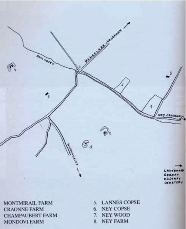 Armed with this additional information Mick found a sketch of the area around Ney Farm. Broebac is the Germanic name for Broembeek, a small channel of water used for irrigation which became an obstacle in the Flanders mud. After reading this, Mick was able to determine that Greg was caught up in the battle in and around Ney Copse and Ney Wood which were only 500 yards apart. As far as I can work out, the German term ‘Totenwäldchen’ translates roughly as ‘Forest of the dead’ which is probably what the German soldiers called the area and which conveys the sight they found after the Commanding Officer of the Irish Guards withdrew his men back behind the Broembeek (called a river by Kipling). However, not everyone got across and that night the Germans ‘shelled vigorously with big stuff all the night of the 13th till three in the morning; stopped for an hour and then barraged the whole of our sector with high explosives till six’.