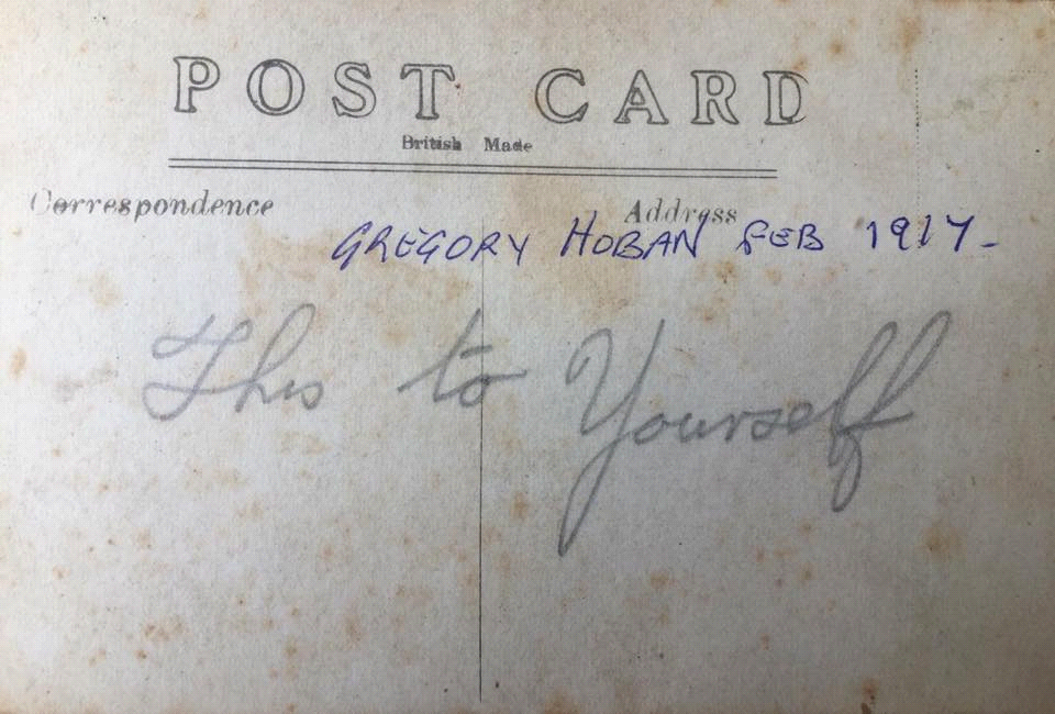The 1911 census of Ireland shows Gregory Hoban aged 12, living with his brother Andrew aged 14, and mother Ellen, a 55-year-old widow. Ellen worked their small farm in the townland of Earlsbog Commons on the outskirts of Gowran. Greg’s occupation on his enlistment form signed on 22 November 1916, his Short Service (For the Duration of the War), gives his trade as ‘Farm Labourer’.