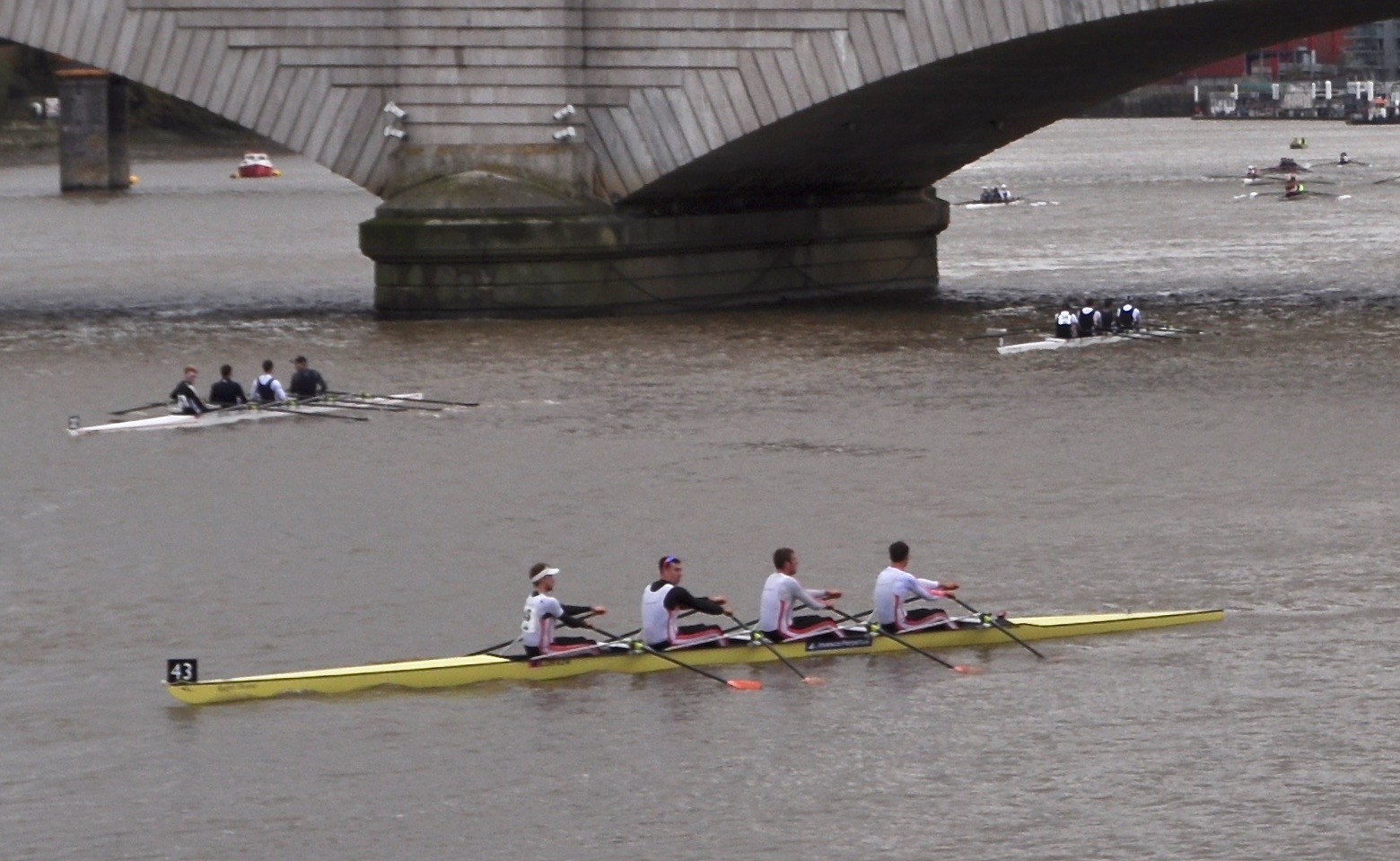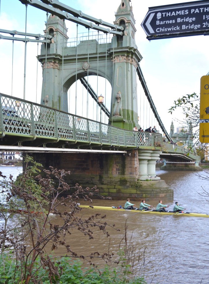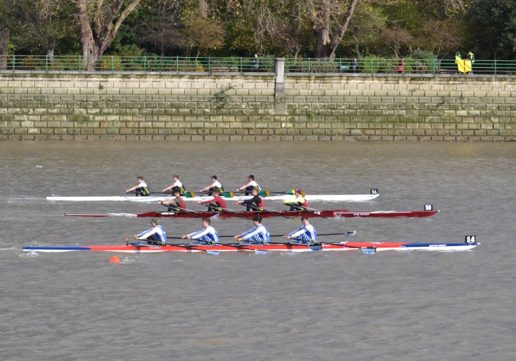 The bright and breezy conditions did cause difficulties for some crews, especially around Chiswick Steps as the strong cross-wind blew crews over to Surrey, resulting in a number of crews hitting a marker buoy. Worst affected were Eton College who collided with a marshal’s launch puncturing a hole in the boat.