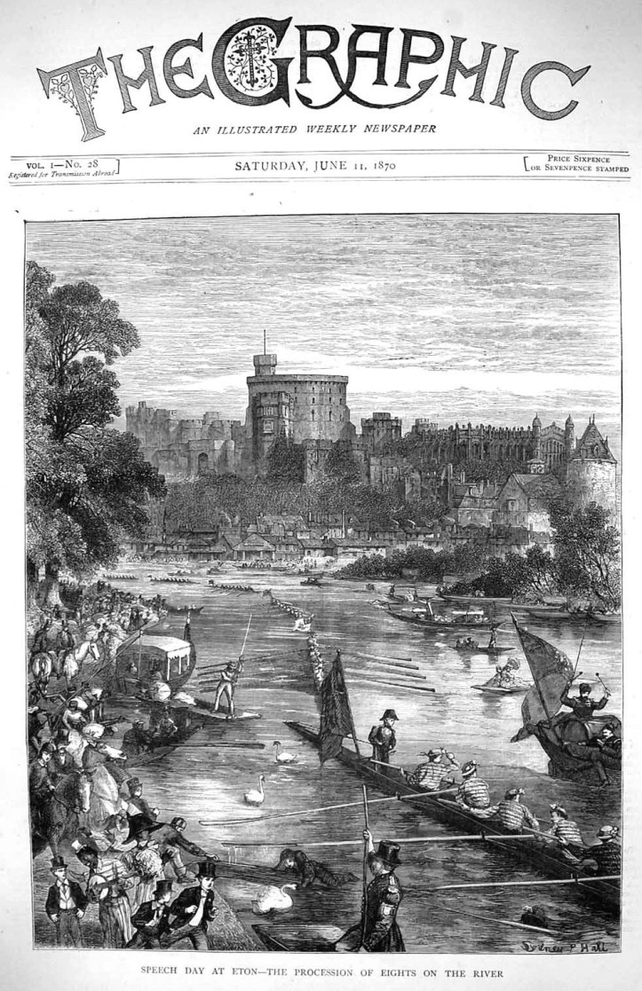 Rowing seems to have become a recreation for Etonians in the final years of the 18th century. The Eton authorities considered it a dangerous activity, however, since the Thames was much used by commercial traffic … and they did their best to discourage the boys. Eton nevertheless challenged Westminster to a race in 1818, but it was not until 1829 that the first race between the two schools actually took place… Rowing was not formally recognised by the school authorities until 1840, and not actively encouraged until about 1860.
