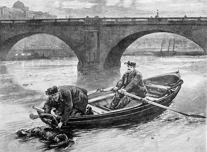 Not many years ago, a well-known waterman, not a thousand miles from Putney, found a corpse on the Middlesex bank of the river. As the reward for such finds is heavier on the Surrey side, what more natural than to lay alongside until dark and then tow it over? [TK: The Surrey coroner gave seven shillings and sixpence, 37 1/2 pence, to those who recovered a body, but his Middlesex counterpart only proffered five shillings, 25 pence, for the same service]. The officer who grants such rewards not being available, and fearful of having his find grabbed before morning, he carried his corpse home, deposited it in his back garden and turned in. His fellow-watermen, however, had been on the watch, and when our friend awoke, the corpse was gone, and the seven shillings and sixpence pocketed by the thieves.
