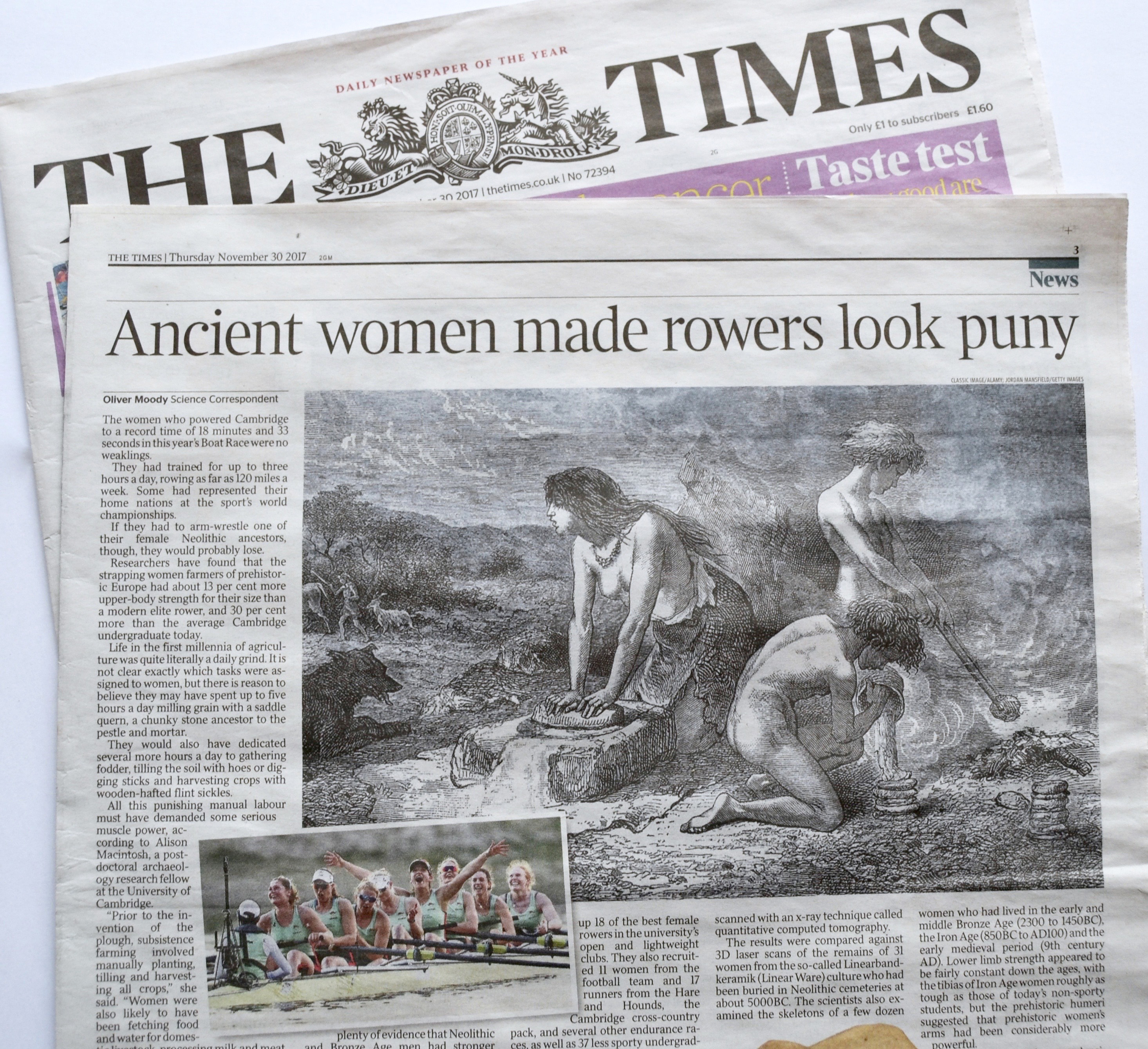 The Times, as illustrated above, went with, ‘Ancient women made rowers look puny’. The opening paragraphs read: