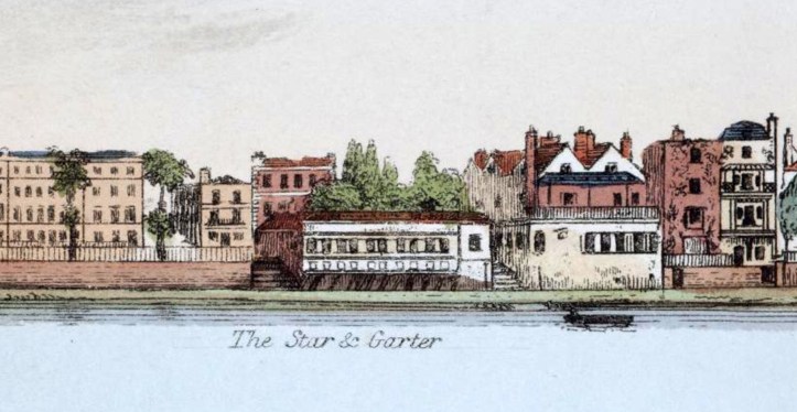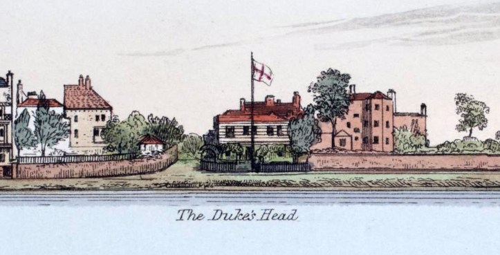 The race stayed directly in front of the town, and thanks to the Panorama of the Thames, we know exactly how it looked in 1829.  The course began at the White Horse Tavern . . .