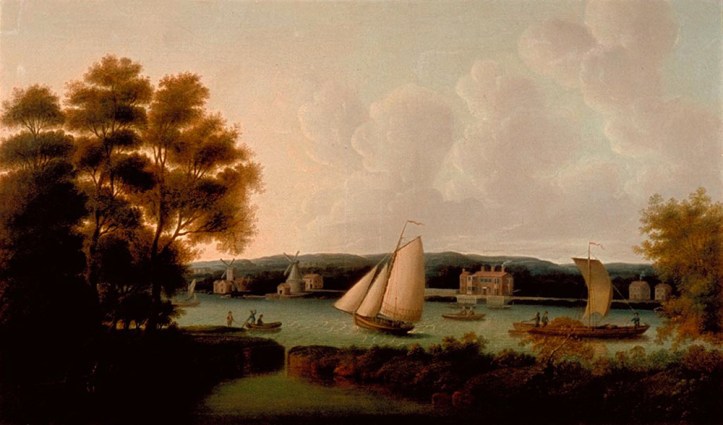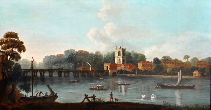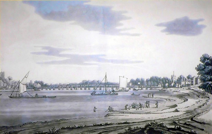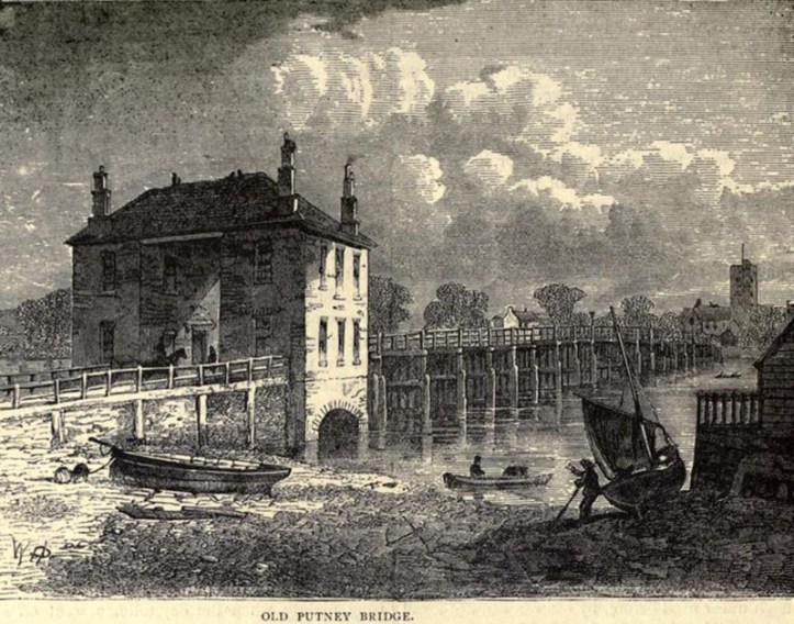Here is a 1793 aquatint by Joseph Farington looking downstream with the villages of Fulham on the left and Putney on the right. The churches on either side can still be seen today.