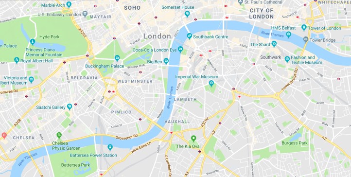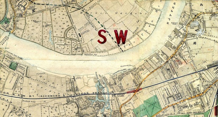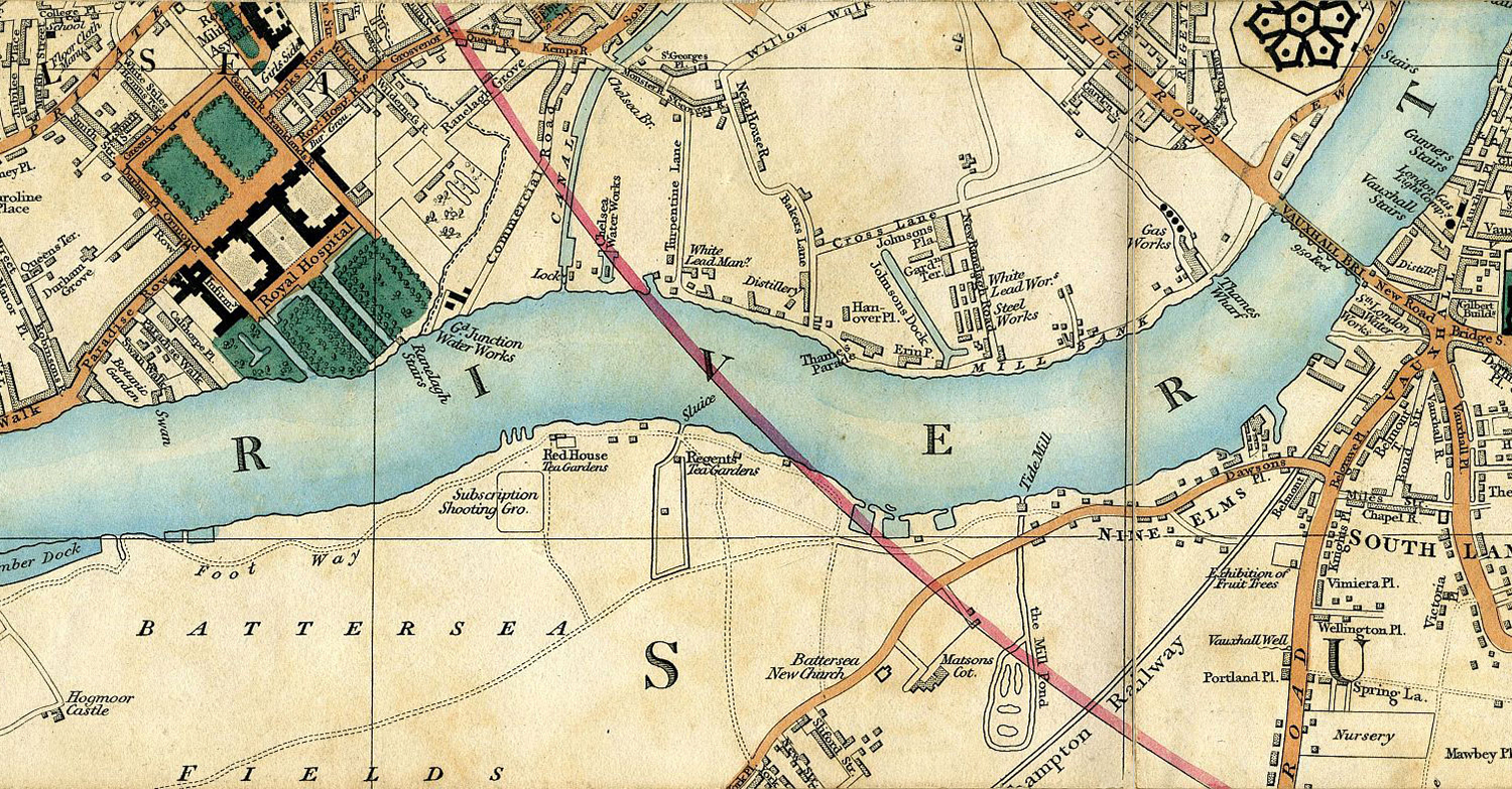 Past the Chelsea Reach, adjacent to Battersea Park, in the lower left corner of the map is Battersea Bridge, with the village of Battersea around the bend on the Surrey bank.