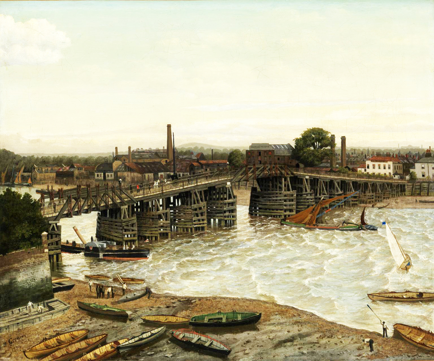 This view towards Fulham, All Saints’ Church and the Bridge Toll House was painted by Joseph Nicholls shortly after the bridge was built.