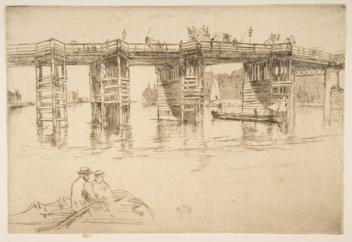 Indeed, that may be Whistler striding over the bridge toward Battersea in this Greaves watercolour. The stairs shown led to the workshop of Greaves’ father, Charles, also a Thames waterman. See the tollbooths. Crossing most bridges in the London environs cost money.