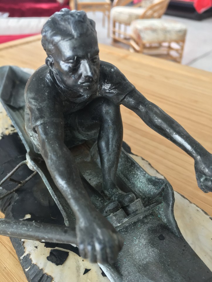 Many years ago, Kai’s parents gave him a small bronze sculling figure, which they had found at an estate sale. Kai writes, ‘It was somewhat damaged when received – ie one rigger and oar handle were missing. I separated the figure from the painted (!) marble base hoping to find some identifying markings on the bottom but no – nothing of the sort.’