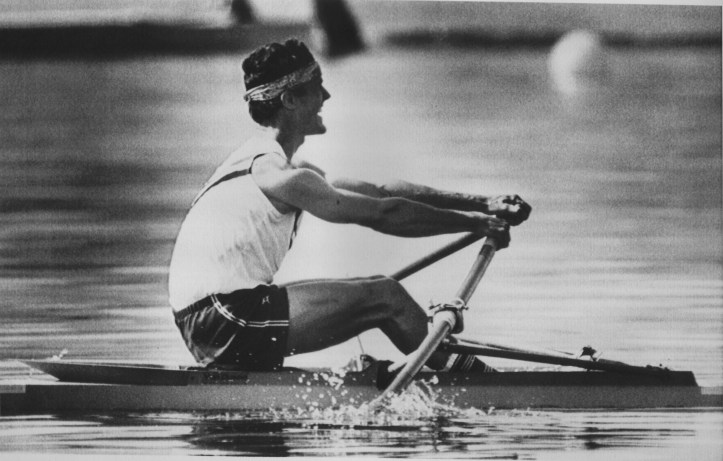 For years this quite large bronze sculpture of John Biglow (see on top) rowed across the grand piano in his parents’ home on a bluff overlooking Lake Washington near Seattle. It appeared to be based upon the famous AP wire photo of John straining at his sculls on Lake Casitas during the 1984 Olympics. It always appeared to me to be quite good but very sad, a lonely figure caught in amber, crying in grief.