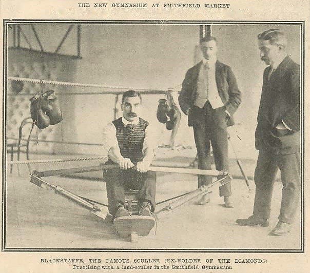 “Training with a land-sculler in the Smithfield Gymnasium” A fore-runner of the Concept II? What was this device? It appears (from the phohot) to create resistance by way of extending the length of two hydraulic cylinders so presumably on a hinged rigger then.. I could not find a single reference online. Does anyone still have one of these?