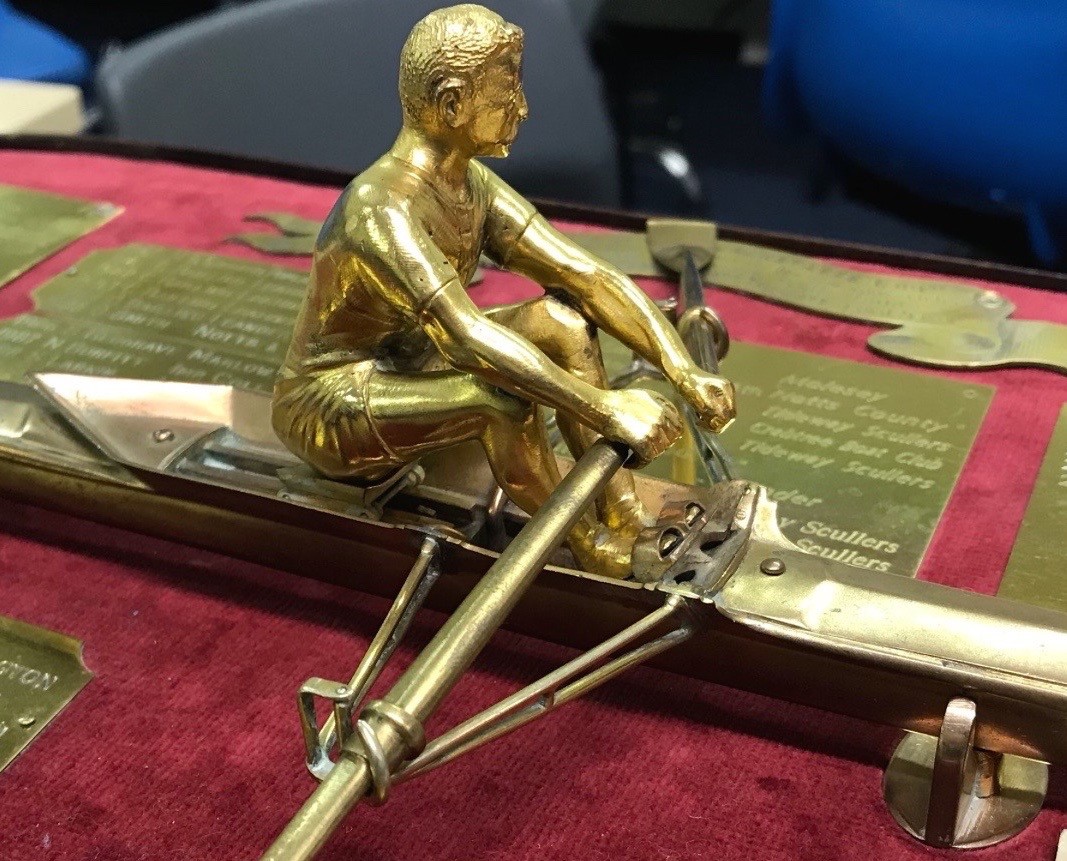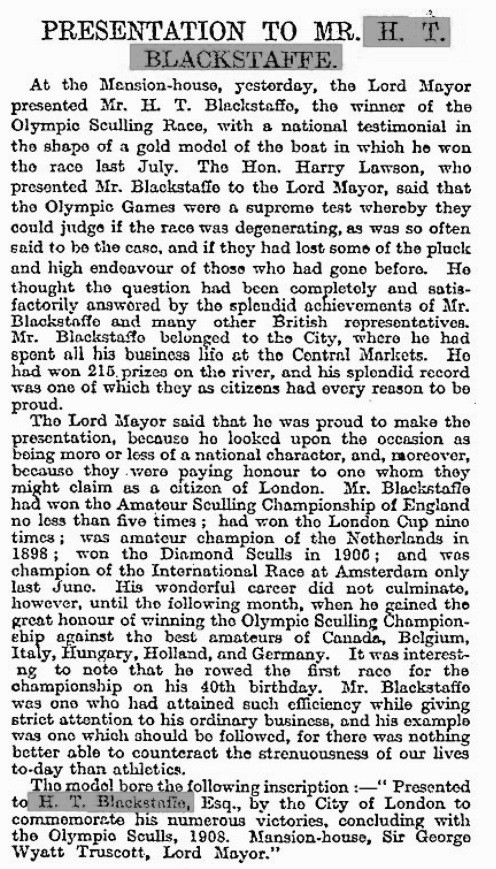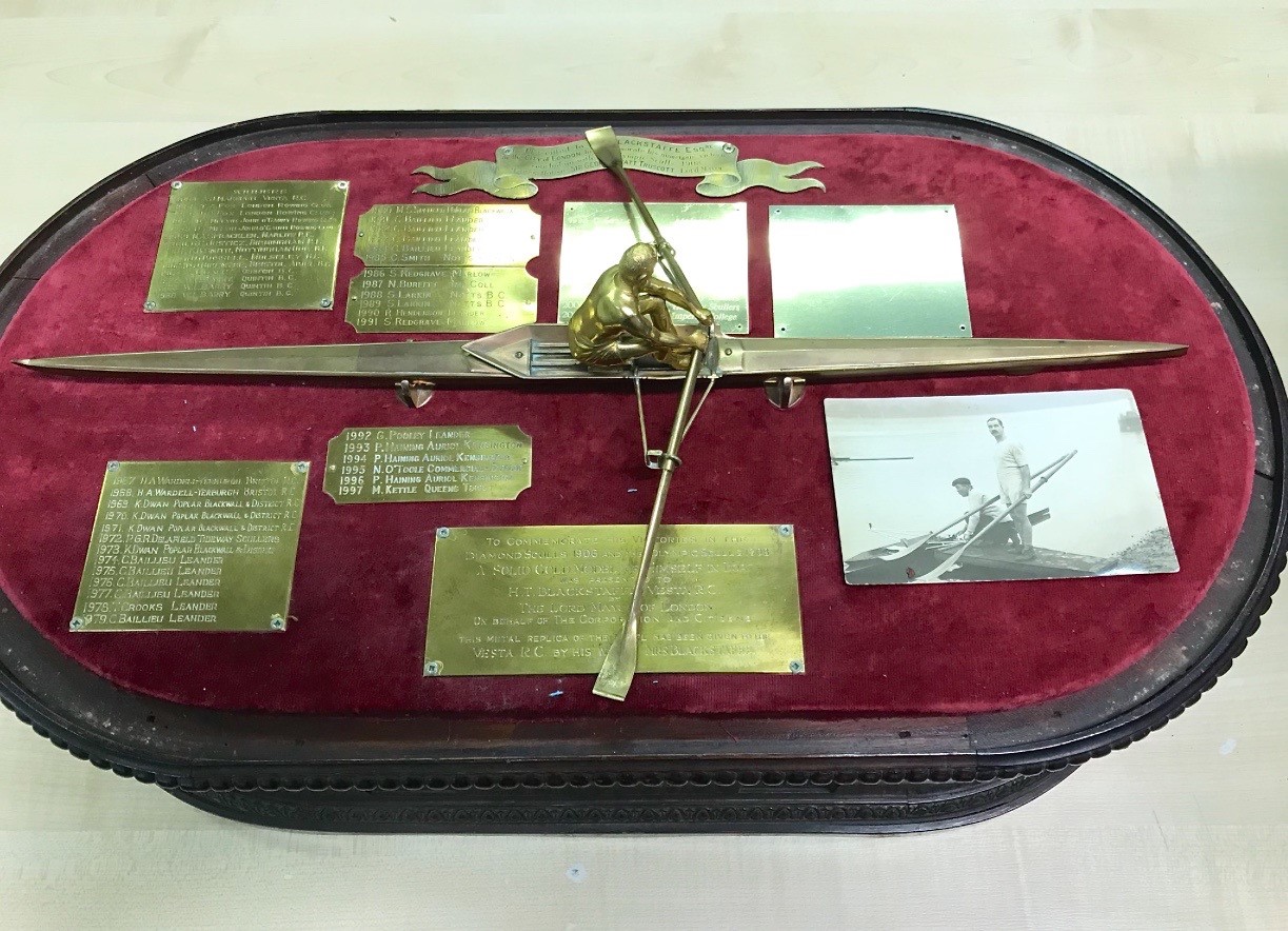 The Blackstaffe Trophy was presented to the Sculler’s Head by Harry’s widow in 1954. It is a brass (I think) copy of a ‘solid gold’ model that was presented to ‘Blackie’ by the Lord Mayor and Corporation of London in 1908 to mark his wonderful sculling career, notably his victory in the Olympic Sculls of that year. The presentation was from the City of London, the historic centre and business district of the metropolis, an area that covers little more than a square mile. This is different to Greater London which, at that time, would have been governed by London County Council. In later years, Blackstaffe was made a Freeman of the City of London. It was reasoned that Harry ‘belonged’ to the City of London as he had spent all of his working life there.