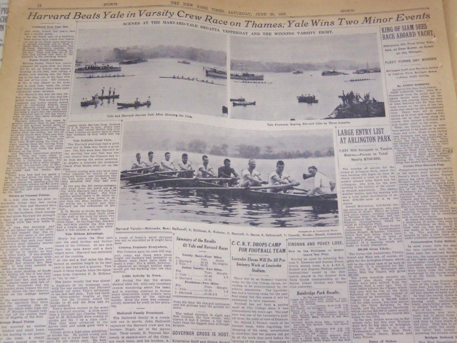 An account of Cambridge’s 1951 separate matches against Harvard and Yale is in this author’s The Oxford and Cambridge Boat Race. The tour began with fun and games because the winning crew in the Oxbridge race was to be rewarded with a trip to America. When Oxford sank soon after the start, a re-row was ordered two days later on Easter Monday. Cambridge won the re-row by an embarrassing dozen or so lengths. The winning one-piece Cambridge boat had to be rushed to Southampton to board the Queen Elizabeth, while the crew flew to the USA a few days later.