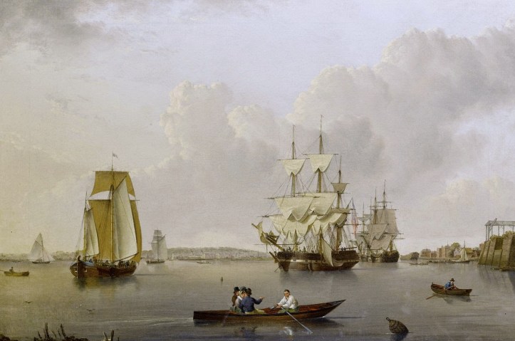 William Anderson “Merchant ships and Indiamen lying off the Isle of Dogs with smaller vessels in the river and Greenwich Hospital on the Opposite Bank”, Private Collection, before 1837. Part 2, 1806 – 1860. Link.