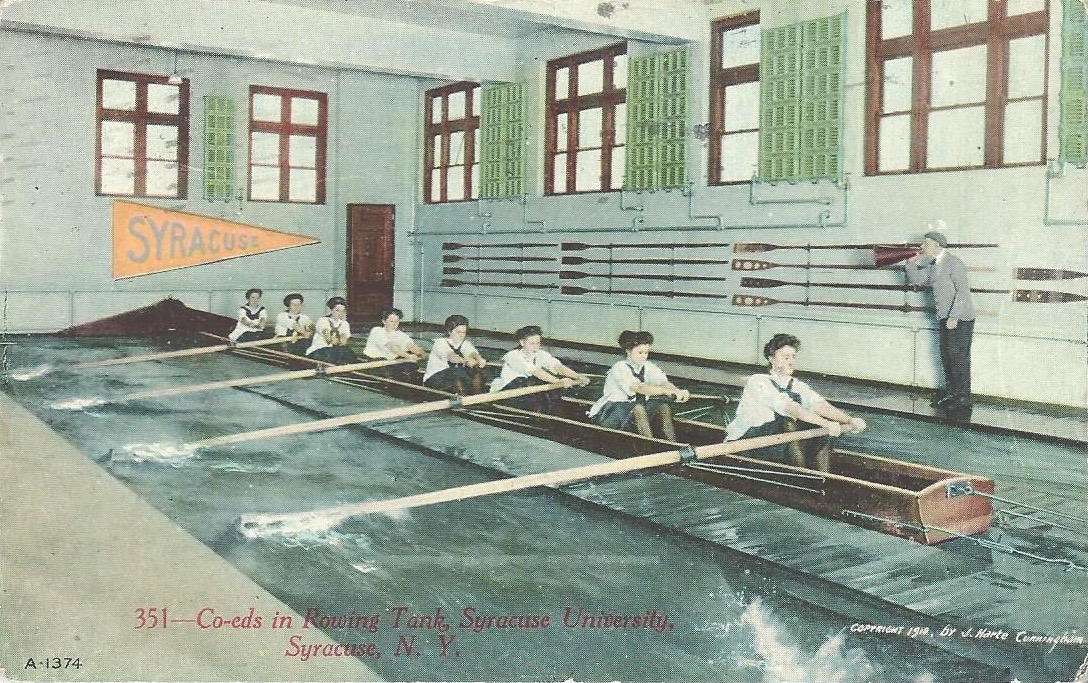 1910: Women in a rowing tank at Syracuse University, New York. Clearly, these were serious training oarswomen, not fine weather leisure rowers.