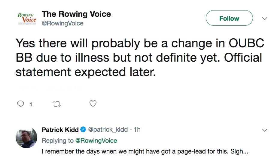 The Oxford line-up as it was at the weigh-in and crew announcement on 26 February. Left to right: Iain Mandale (B), Felix Drinkall (2), Will Cahill (3), Anders Weiss (4), Will Geffen (5), Joshua Bugajski (6), Claas Mertens (7), Vassilis Ragoussis (S), Zachary Thomas Johnson (Cox).Oxford men’s coach, Sean Bowden (left), outside the Dark Blue’s Putney headquarters, Westminster School Boat Club.Only seven oars?OUBC goes afloat. The line-up was: Claas Mertens (B), Vassilis Ragoussis (2), Will Cahill (3), Anders Weiss (4), Will Geffen (5), Benedict Aldous (6), Iain Mandale (7), Felix Drinkall (Str), Zachary Thomas Johnson (Cox).OUBC President Iain Mandale at ‘7’, Benedict Aldous at ‘6’.The crew compressed.Passing Barn Elms.Approaching the Mile Post.At Harrods.A break at Chiswick.Tideway conditions.Going home - going through Barnes Bridge.Rough water at Chiswick.Starts at Putney.After the outing, Rachel Quarrell Tweeted this. An official statement is expected around 3 p.m. GMT today.