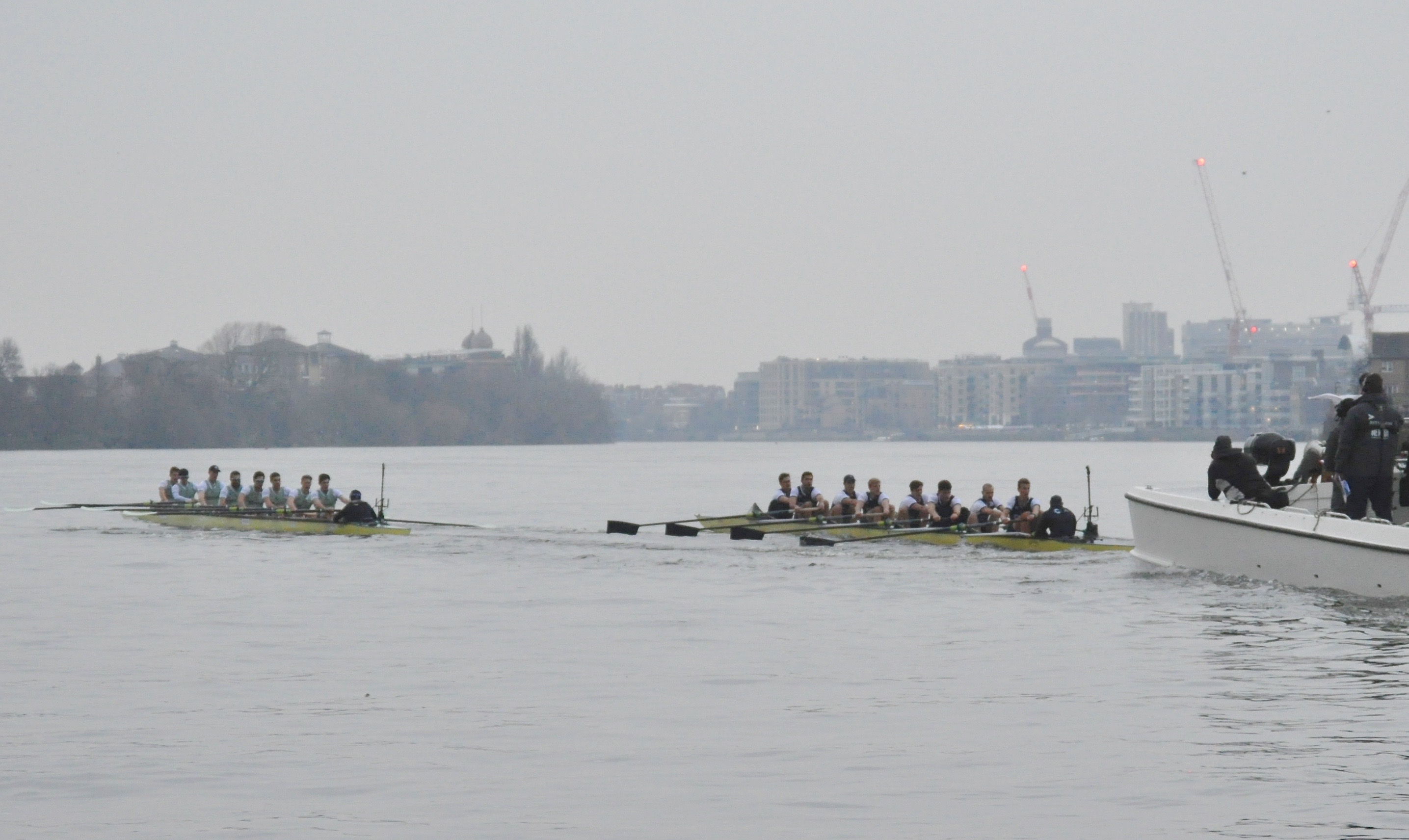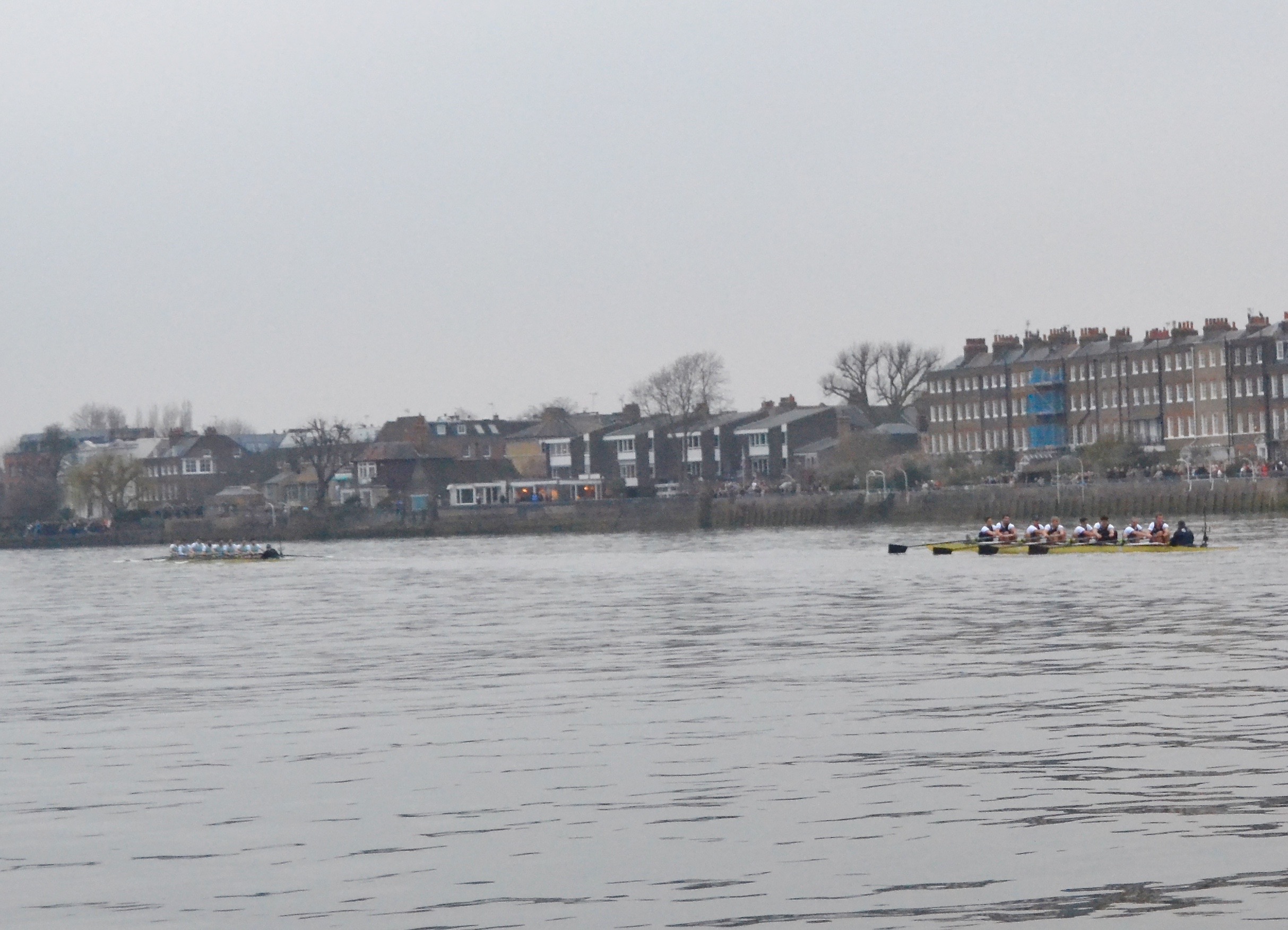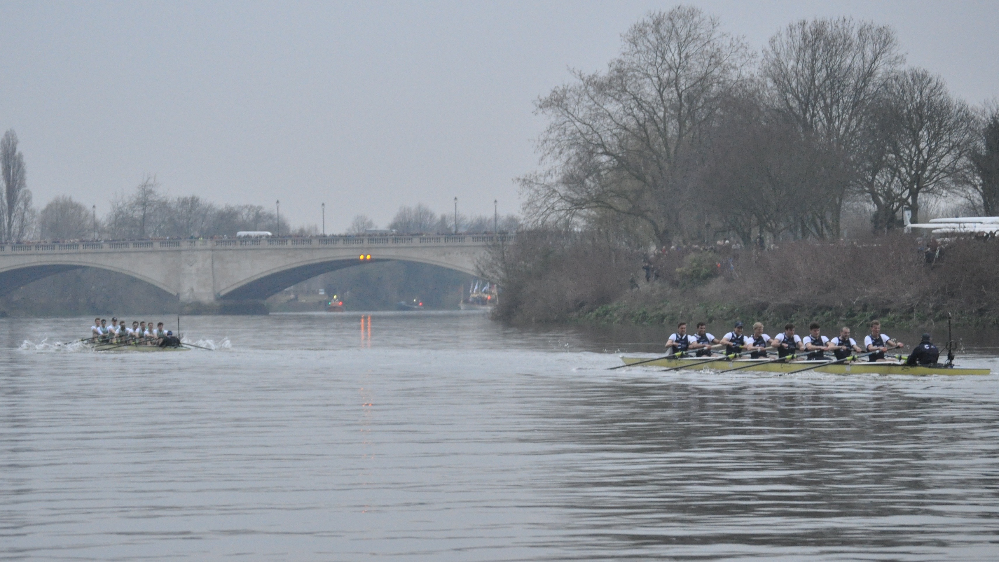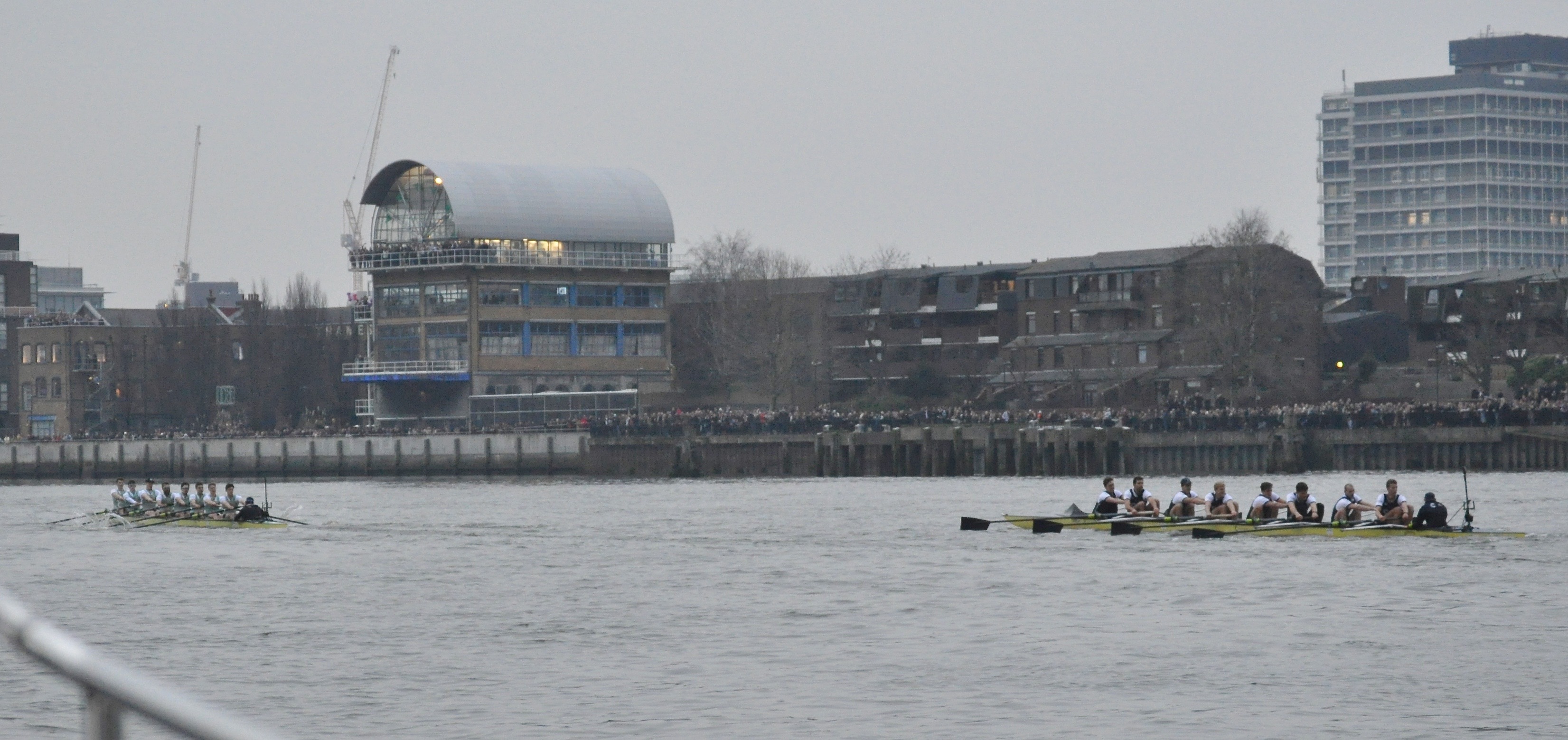 Waiting for the start is anticipation tinged with anxiety. The sky is brooding slate-grey, the flags are limp – including the university boat clubs’ colours indicating stations on towers of the Putney and Fulham churches at either end of the bridge. The chopper noise is deafening, the crowd on bridge, banks and balconies immense, while cranes hover over cliffs of luxury apartments on the Wandsworth shore downstream. Red buses on the bridge and glittering lamps add a bit of colour as the flotilla waits.