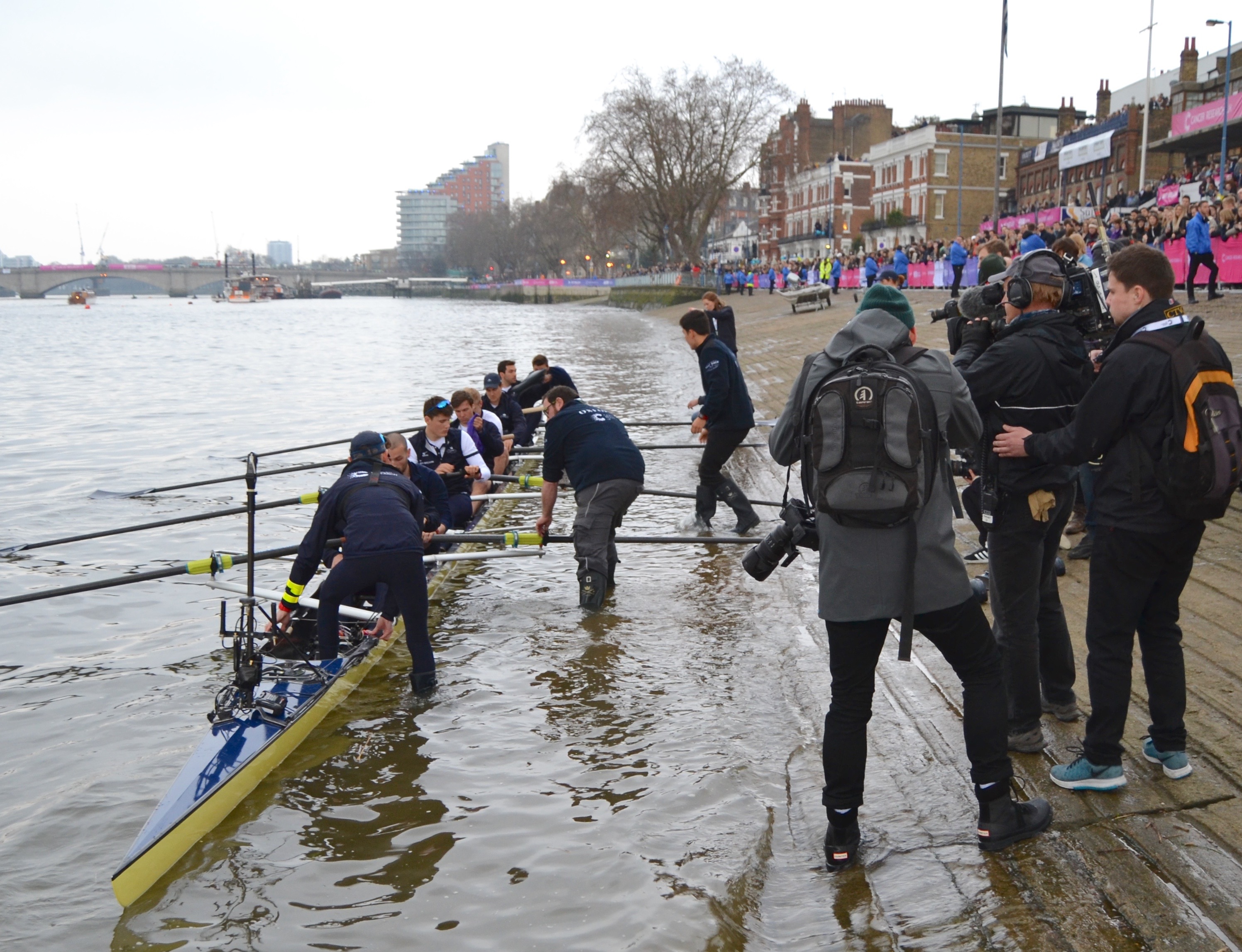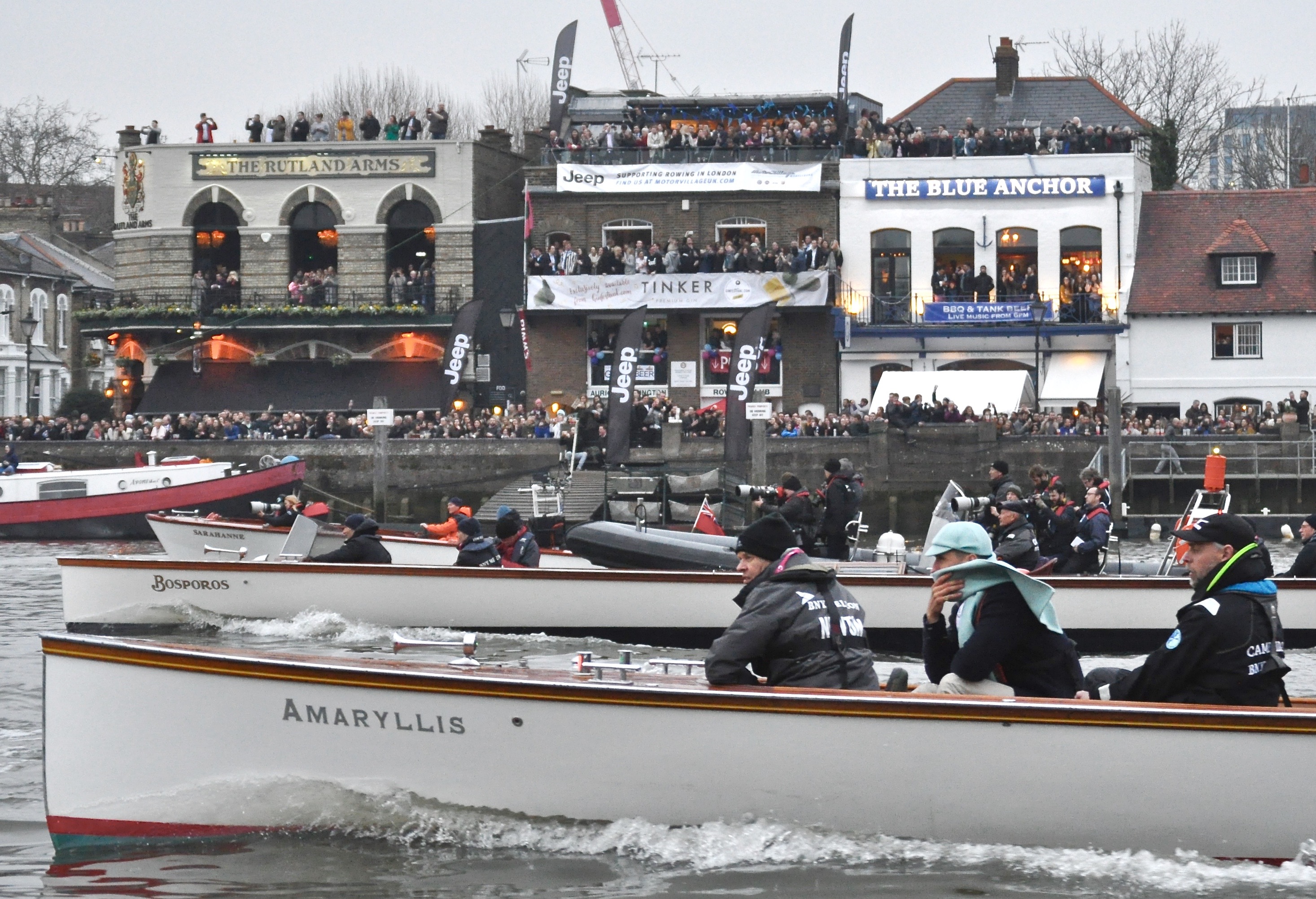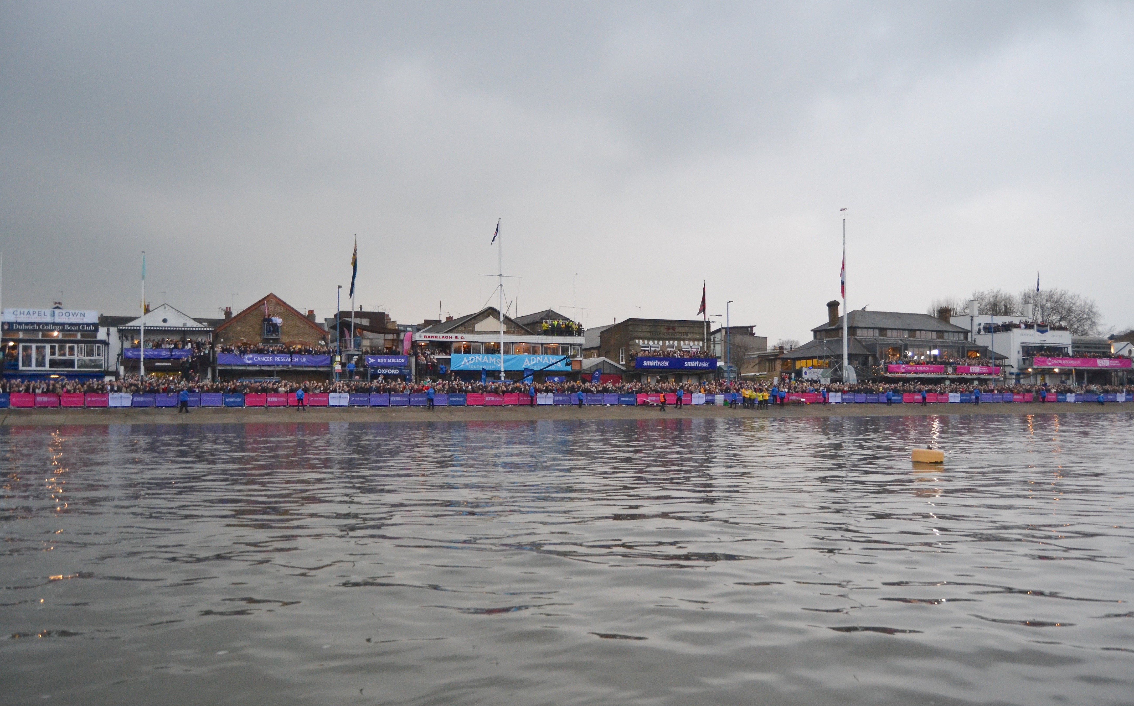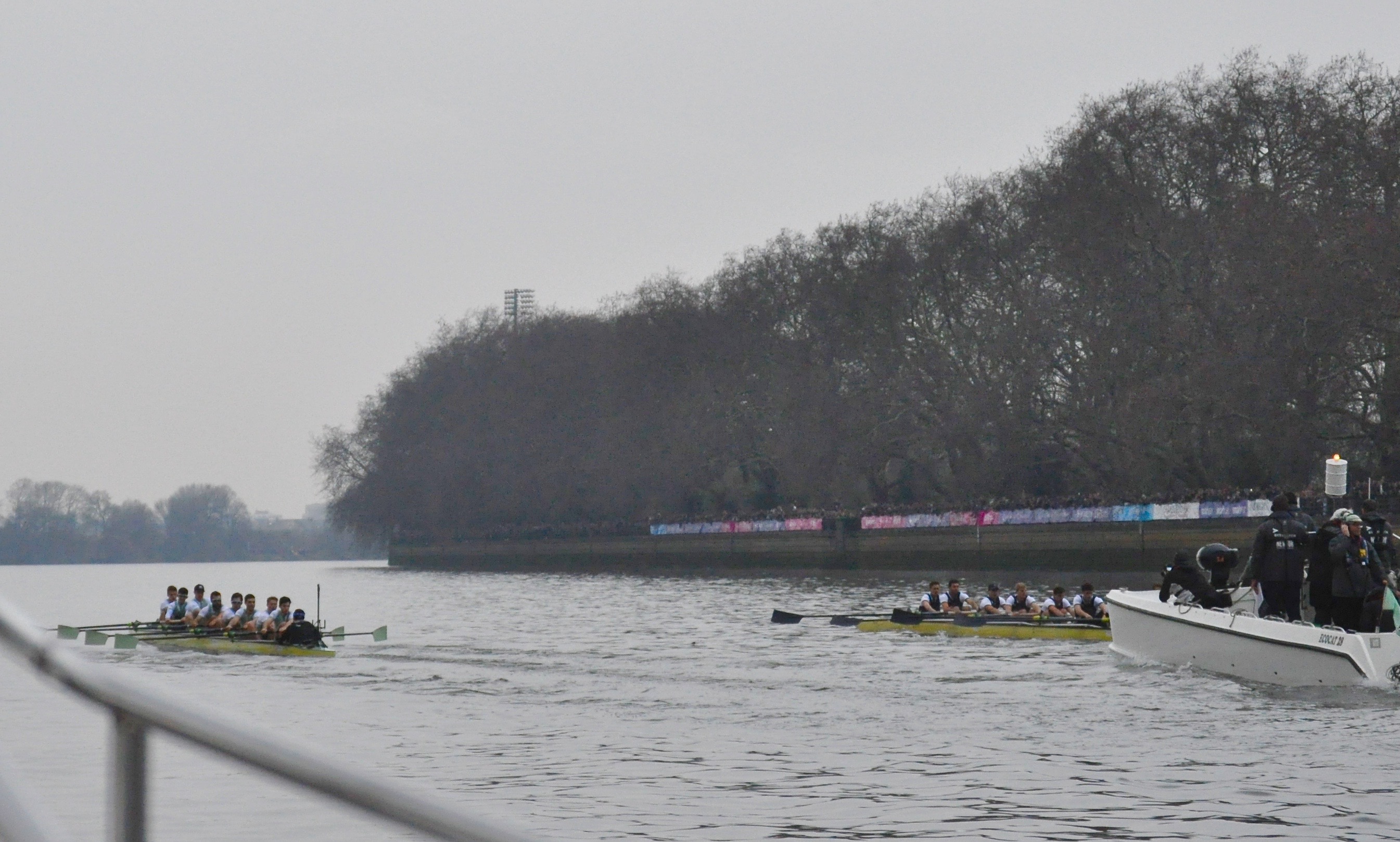 Waiting for the start is anticipation tinged with anxiety. The sky is brooding slate-grey, the flags are limp – including the university boat clubs’ colours indicating stations on towers of the Putney and Fulham churches at either end of the bridge. The chopper noise is deafening, the crowd on bridge, banks and balconies immense, while cranes hover over cliffs of luxury apartments on the Wandsworth shore downstream. Red buses on the bridge and glittering lamps add a bit of colour as the flotilla waits.