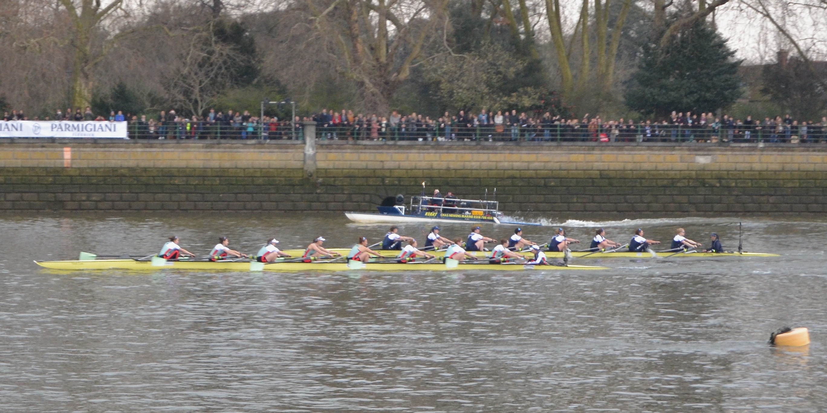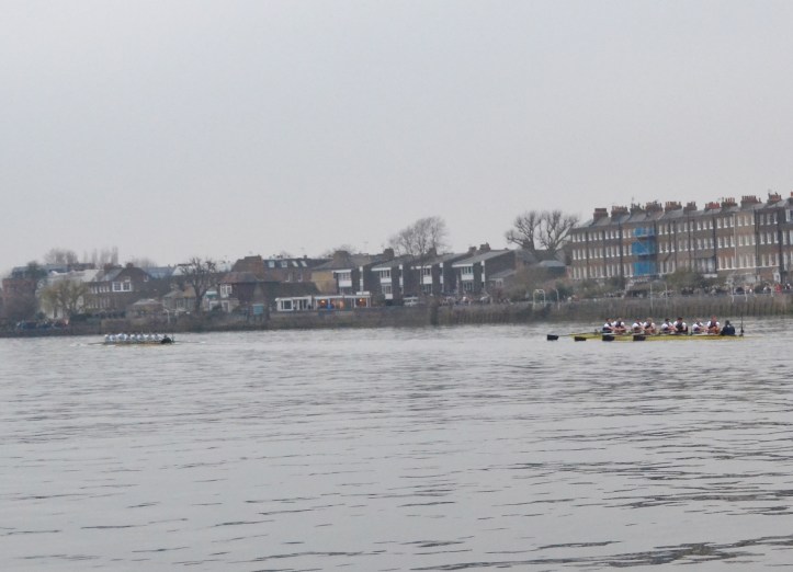 As a preamble to Chris’s piece, there follows some of my pictures of Putney as it got ready for its big day. Apologies for the poor quality of my race photographs, the late start meant that there was exceptionally bad light. Further, while I was flattered to be asked to do the backup timing for the race, the downside of this was that I had to stop taking pictures as we approached the timing points (the Mile Post, Hammersmith Bridge, Chiswick Steps, Barnes Bridge, and the finish) so I could find the flagman on the bank who was to drop his flag as each boat crossed his line of sight. In poor light and with the signalman obscured by the crowd and by foliage, this was a difficult and nerve-racking task. Other hindrances to producing pleasing and informative images were the problems of picturing two crews that were far apart, and the fact that the boat that I was on had railings at just the right height to bisect views of the crews. It was, however, still a great thrill to be part of the following flotilla.