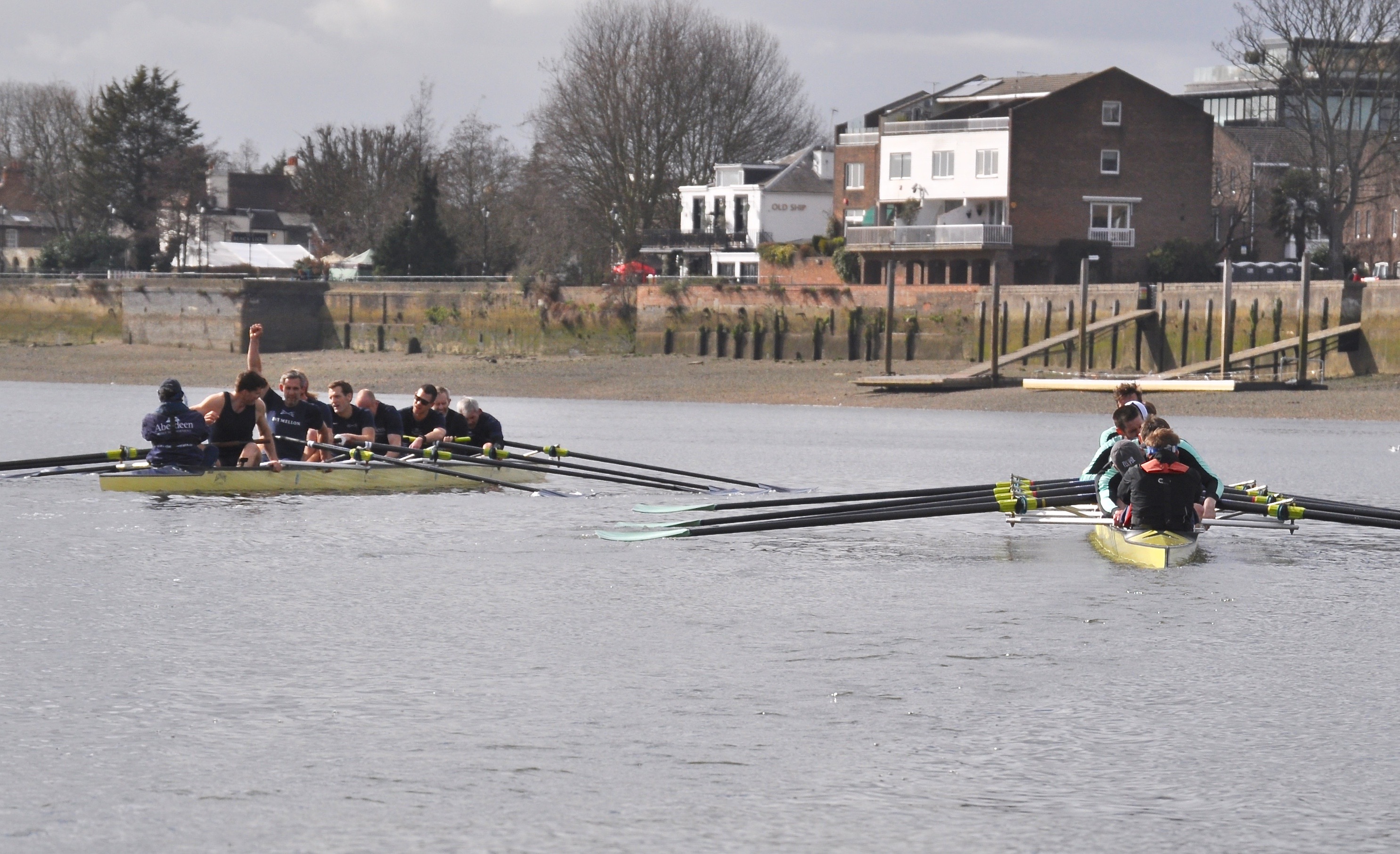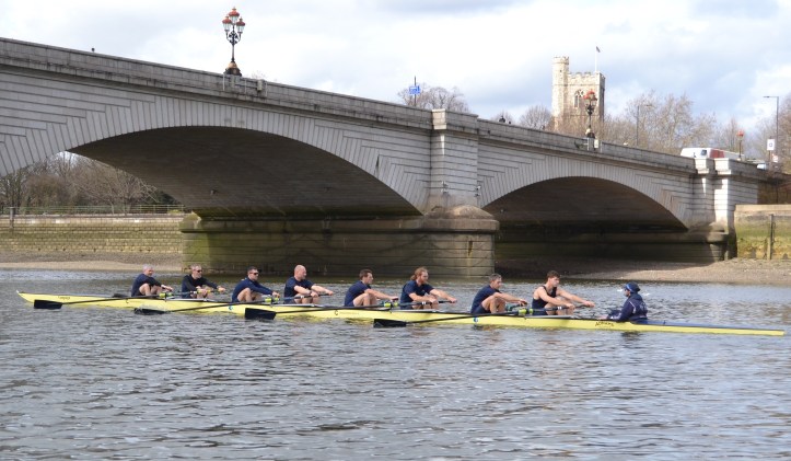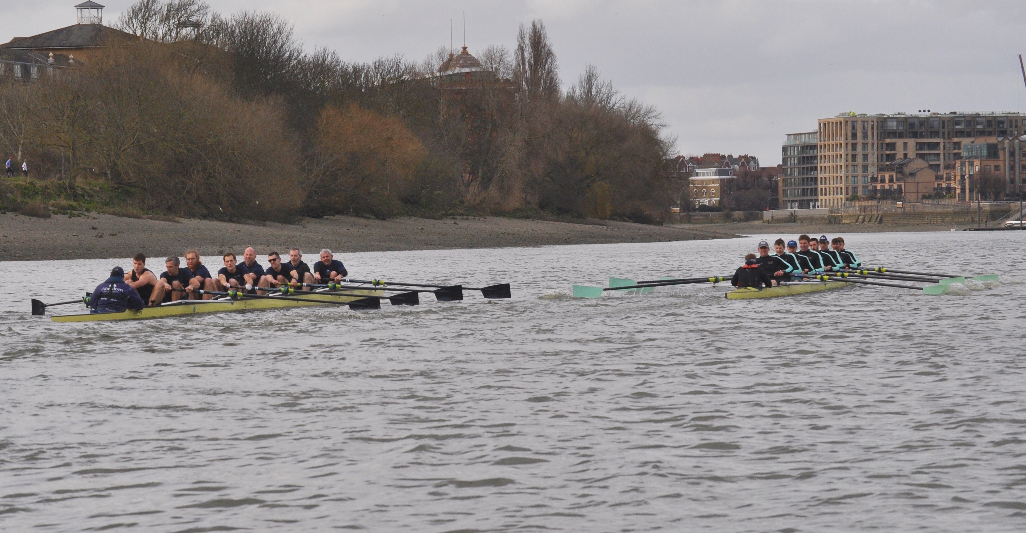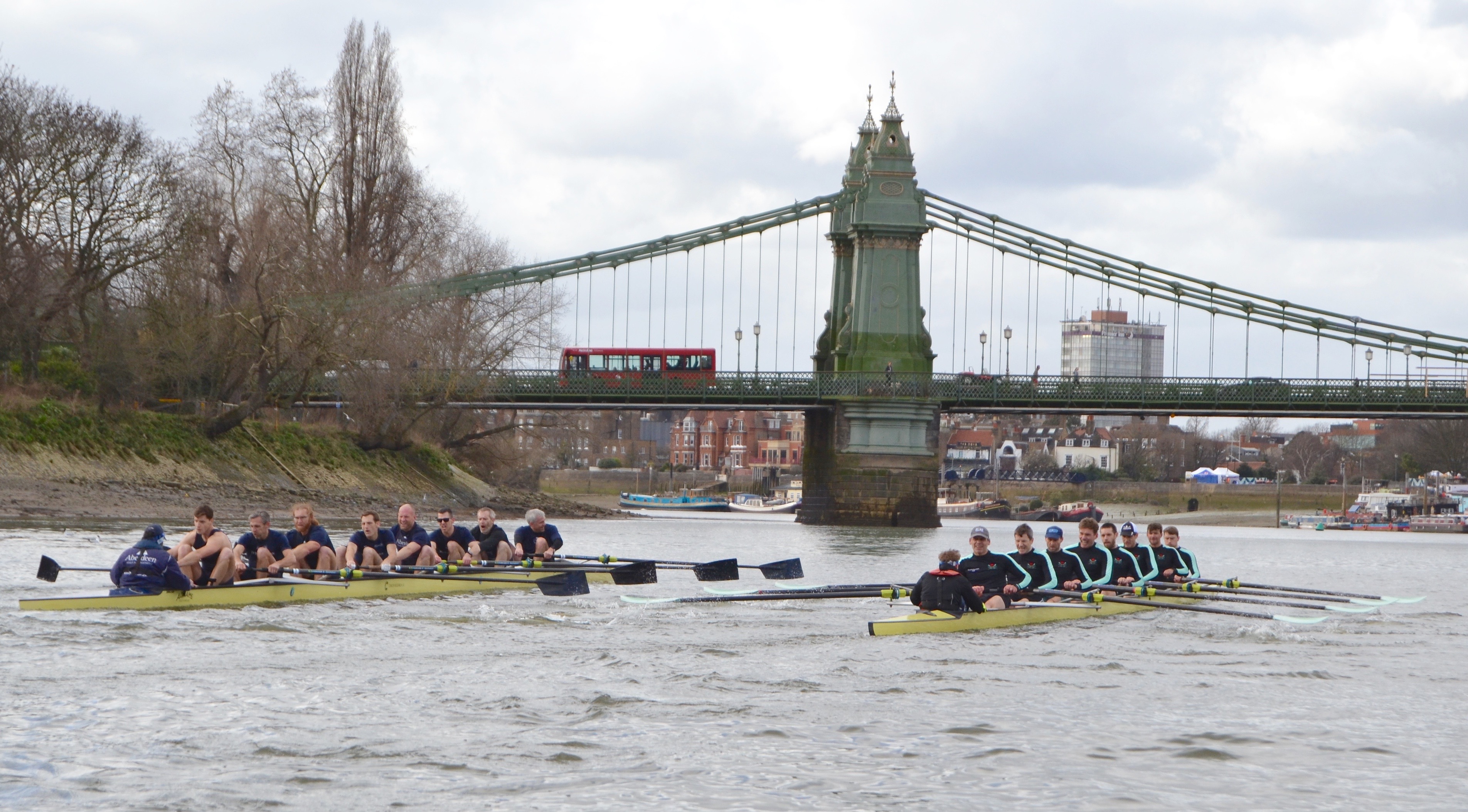 Any boat race that has the gentlemanly rule that ‘any verdict within six feet shall be declared a dead heat’ gets the HTBS mark of approval. For several years, I have had the pleasure of following the Oxford – Cambridge Veteran’s Race, run over 2 km from the Boat Race start to the steps between upstream of Hammersmith Bridge and St Paul’s School ramp ‘being the line where the two bends equal out’. Friday, 23 March was the 23rd time that the Oxbridge veterans (or ‘masters’) had met, the score before the race standing at Oxford 7, Cambridge 15. The minimum age for the alumni is 35 and the crew average must not be less than 42. The race is usually run on the day before four other Oxford – Cambridge clashes when some young people race from Putney to Mortlake.