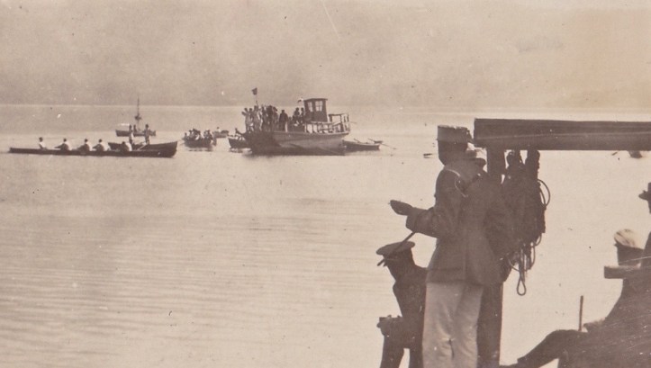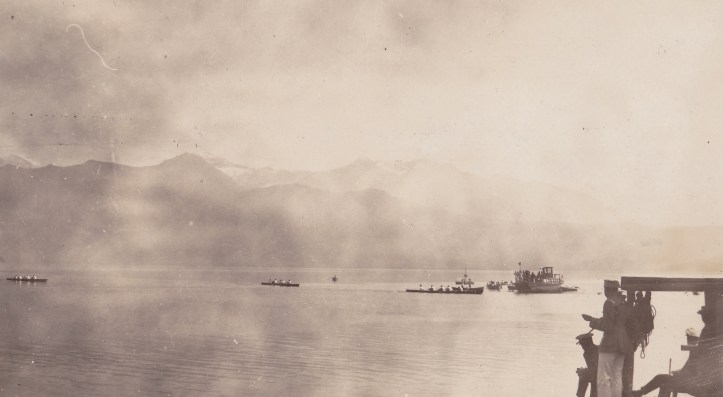 Occasionally, my searches for new aspects of rowing history will take me down a non-rowing (but still interesting) path. This happened recently while I was scanning eBay for rowing material. I came across the above early 20-century postcard showing a boat race on a large lake surrounded by mountains. It was not a good picture, lacking any detail, and I would not have given it much consideration but for a handwritten explanation on the back: