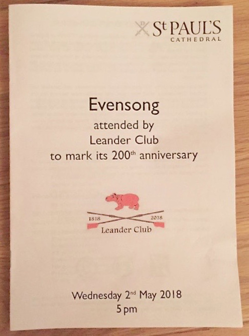 As I walked up Ludgate Hill towards Christopher Wren’s monumental edifice, I couldn’t help the mischievous wish that I was going to confession instead of evensong to celebrate Leander Club’s 200 years as a temple of rowing. The Pink Palace must have chalked up a few, if not a multitude, of sins since a crew first took to the water from Searle’s boathouse – now the site of St Thomas’s Hospital, in 1818. Imagine being on the receiving end of hippo confidences!