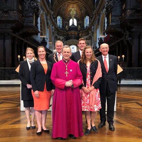 I banished all such thoughts as I entered the cavernous St Paul’s and found a seat under the dome among Leander’s faithful. The cathedral is certainly awe-inspiring in both sight and sound – the pre-service organ recital appropriately gave us wasserfluesse by Bach and water music by Handel. When the choir and ministers processed to their stalls, I did a double take when I spied a scarlet robe and skullcap. How did a Doggett’s winner mix among the priesthood? But he turned out to be our preacher, the Emeritus Bishop of Menevia. More of him later.