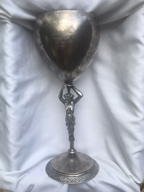 The Yale varsity won its first championship in 1873, when a six-man crew, trained in the “Bob Cook stroke” by their teammate who had just returned from observing English rowing, raced over the downstream Connecticut River course to claim victory despite a contested result on an irregular finish line. Rowing on the still new sliding seat, Yale defeated, in 16:59, Wesleyan, Harvard, Dartmouth (coached by John Biglin), Amherst (coached by Ellis Ward), Columbia (coached by Hank Ward), Bowdoin, the Amherst “Aggies” (coached by Joshua Ward), Cornell, Trinity and Williams. Each of the victorious oarsmen was presented with a Gorham sterling silver goblet.