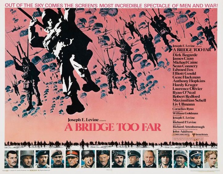 On my list of the Top 10 War Movies is A Bridge Too Far, which was produced by Joseph E. Levine and Richard P. Levine and directed by Richard Attenborough. The film, released in 1977, is based on Cornelius Ryan’s book of the same name which was published in 1974. The book/film tells the story of Operation Market Garden – the largest airborne operation up to that date in World War II – launched by the Allies in September 1944 to break through German lines and seize nine important bridges in the occupied Netherlands, including the one at the city of Arnhem over the Rhine River. By seizing the bridge at Arnhem, the Allies would be able to cross the border to Germany to attack the German industry in the Ruhr area.