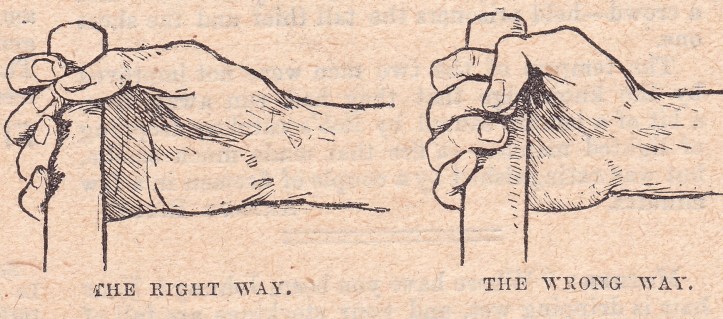 Woodgate’s illustration on how an oar should and should not be held. Grasp it in the wrong way and you could be mistaken for a Belgian oarsman.