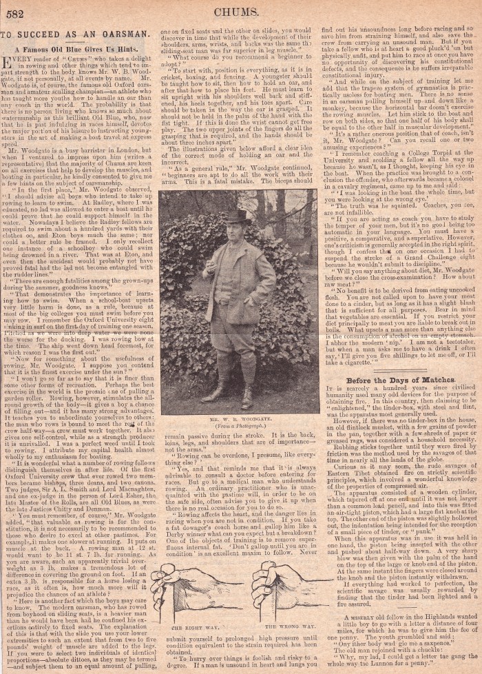 Every reader of ‘’Chums’’ who takes a delight in rowing and other things which tend to impart strength to the body knows Mr W.B. Woodgate, if not personally, at all events by name. Mr. Woodgate is, of course, the famous old Oxford oarsman and amateur sculling champion – an athlete who has taught more youths how to handle an oar than any other coach in the world. The probability is that there is no person living who knows so much about watermanship as this brilliant Old Blue…