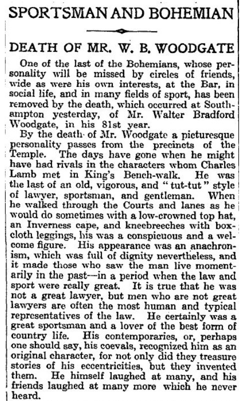 Woodgate’s obituary in ‘’The Times’’ of 2 November 1920 called him a ‘Sportsman and Bohemian’. The first two paragraphs are reproduced here.