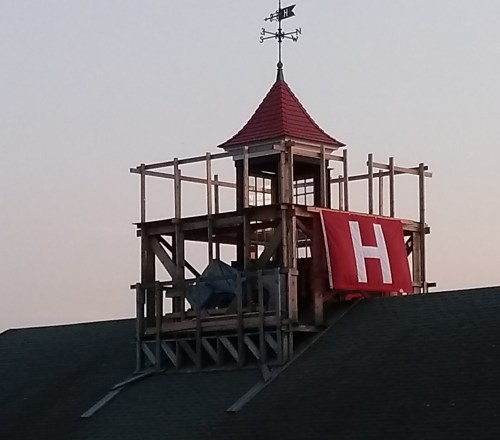 Attending Friday evening’s 2018 Regatta Cocktail Party at Harvard’s boathouse Red Top, where the schools’ alumni but also families, friends and locals, had gathered in unity to celebrate today’s Yale – Harvard Regatta, I noticed that the red top on Harvard’s boathouse was getting a ‘fresher-upper’. Carpenter and painters are none other than HTBS friends Bob Berry of ‘The Remote Coxswain fame’ and Irish rower Seamus McGrath from Noank RC.