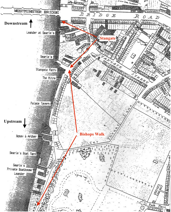 Over the years, Searles had four properties on the stretch between Westminster Bridge and Bishop’s Walk, near Lambeth Palace, with Leander seeming to move to the best that their landlord could offer at the time. In The Brilliants, it is recorded that Searle’s held leases at Stangate Wharf from 1729 until 1857, and at Bishop’s Walk from 1773 until after 1853. The book continues that there is some evidence that there was a time (the 1840s?) when Searle looked after Leander’s boats but the crews were changing at, and boating from, George Renshaw’s Yard, sited at 7 Bishops Walk, upstream of Searle’s (possibly to avoid the river traffic generated by the rebuilding of the Houses of Parliament). A c.1860 photograph of J&W Roberts, Boatbuilders, at 6 Bishops Walk is here.