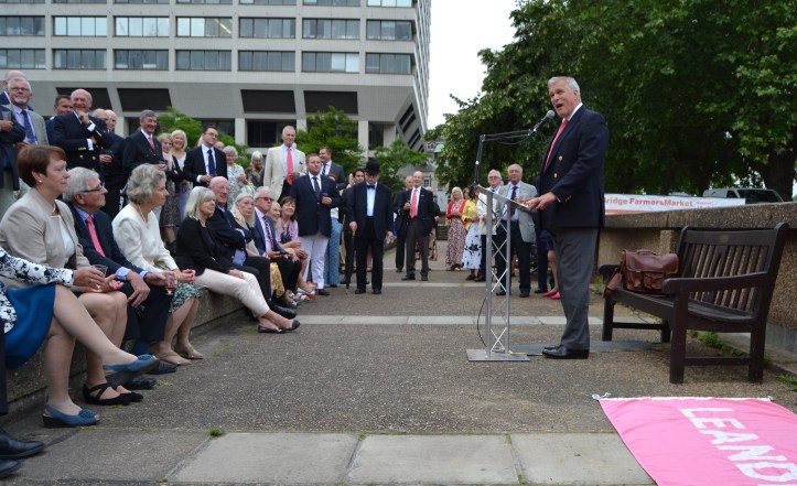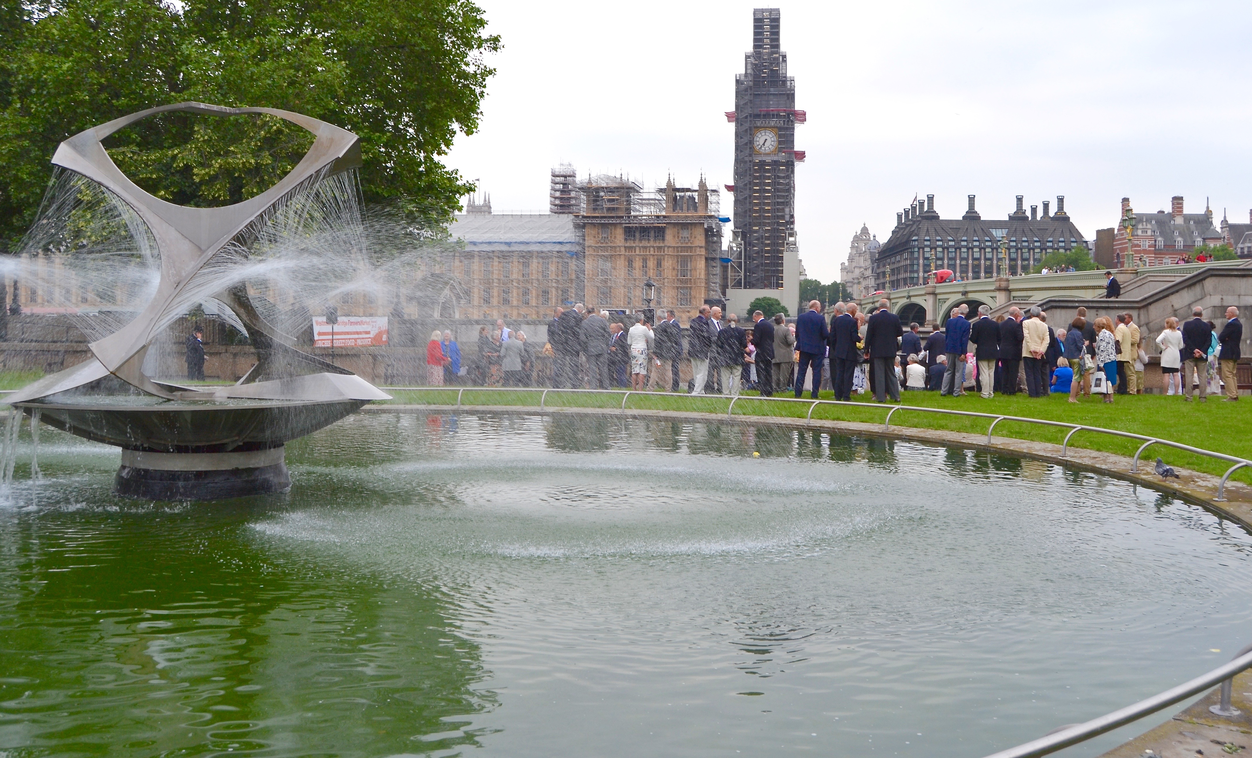 Prior to the unveiling of the plaque (or ‘memorial slab’), 200 Leander members enjoyed afternoon tea on the terrace of the House of Commons, courtesy of Lord Moynihan (who, as Colin Moynihan, coxed Oxford to victory in 1977 and the British eight to Olympic Silver in 1980).The view from Westminster Bridge. Parliament is on the right, and the 1970s and 1860s buildings of St Thomas’ Hospital, now occupying the site that once was home to the Searle boathouses, is on the left. After their Commons tea, Leander members processed en masse over the bridge to the hospital gardens and the plaque unveiling ceremony.The Fountain Gardens of St Thomas’ Hospital. St Thomas’ is a National Health Service teaching hospital, free at the point of use, which has its 12th-century origins in nearby Southwark but which has been on this site since Searles and other Lambeth riverside homes and businesses were swept away by the building of the Albert Embankment in the late 1860s. As Parliament is still technically a Royal Palace, the convention is that any commoner who dies there is officially recorded as having died at St Thomas’ Hospital to remove the need to convene a jury of members of the Royal Household.Leander members gather around the plaque which is set in the ground, almost directly facing the currently scaffold clad clock tower popularly known as Big Ben sited on the opposite bank of the Thames.Jeremy Randall, President of Leander Club, makes a short speech prior to the unveiling. He is having a very busy year with bicentennial events taking him to Downing Street, Dublin, Sydney, St Paul’s, New York and now Westminster.Jeremy and his wife, Irene, remove the Leander flag to reveal the commemorative plaque. It was financed by private donations.