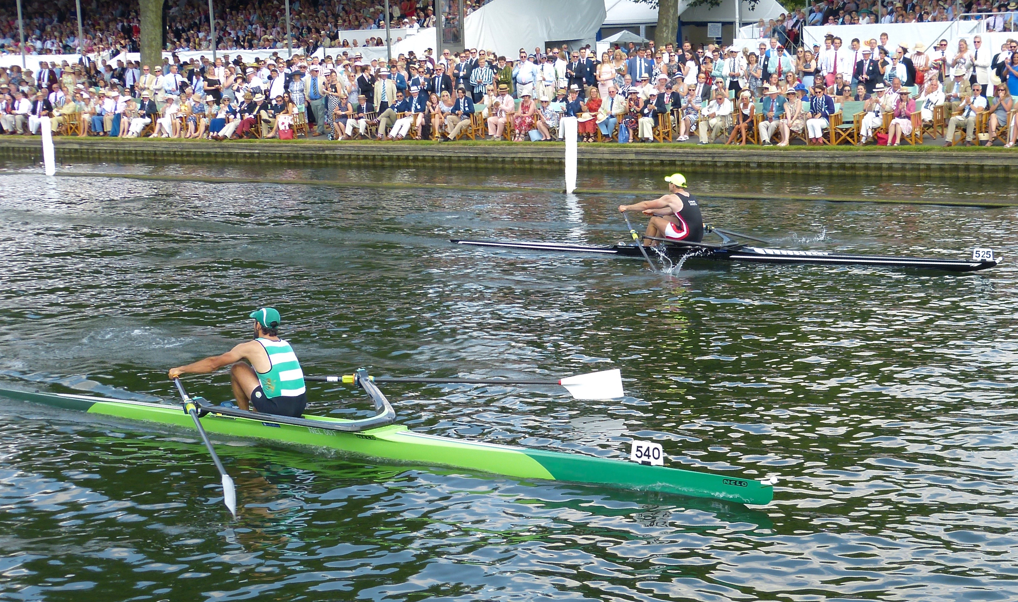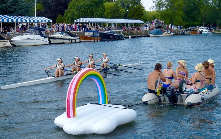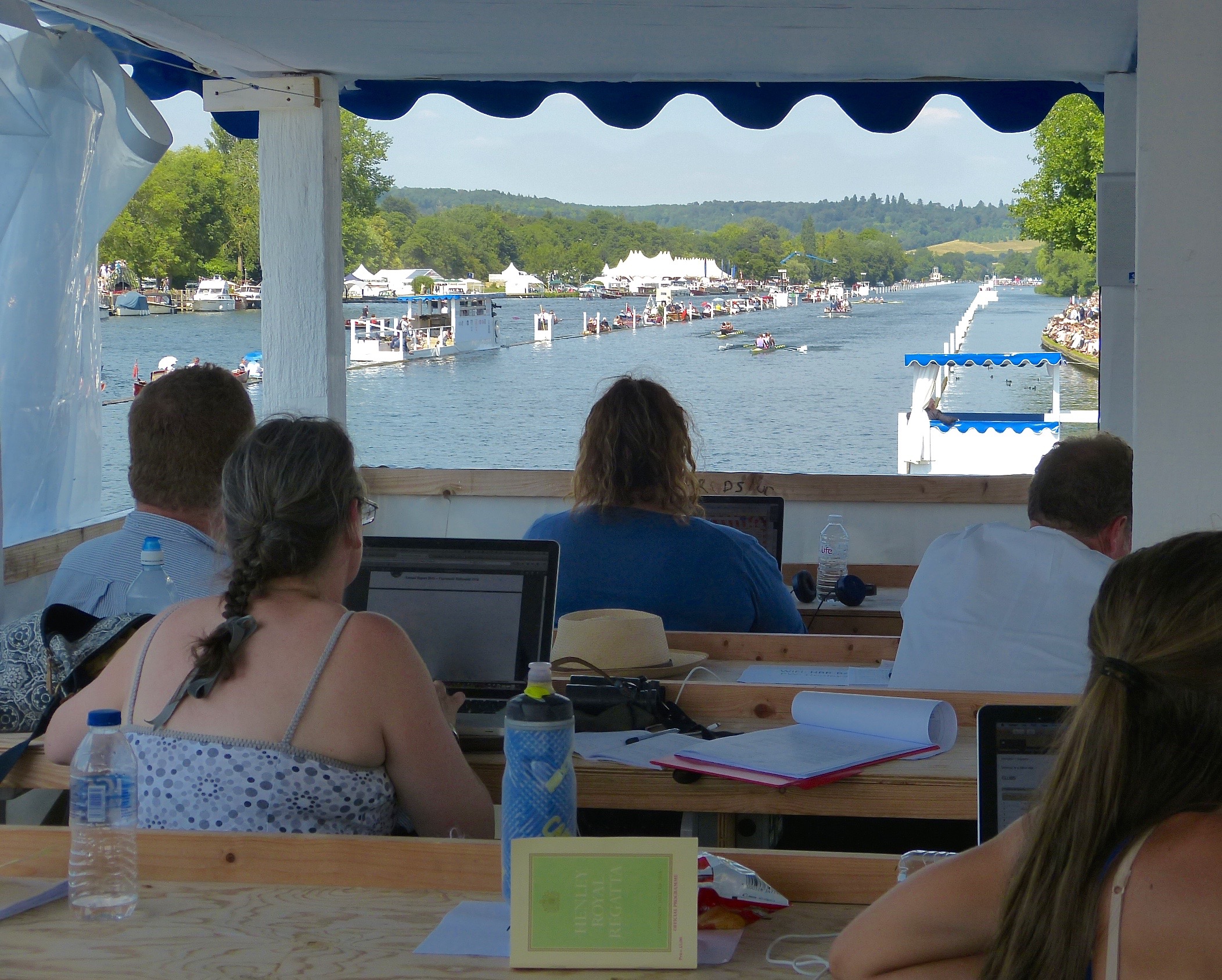 Once again, the (italicised) race reports below are from the Press Office, a place manned by hardy souls, who spend the entire regatta in the airless structure that was once called the Press Tent, but which is now some sort of ridged construction mounted on a floor above the crews’ Enquiry Office, weighing room and medical centre. The old Press Office had a hatchway into the bar next door, but that was a legacy of the time when there was a rowing press, a body comprised of old gentlemen banging away at typewriters and dictating their copy over the telephone (‘Is there a girl available?’). Nowadays, photographers dominate, and the remainder are young men and women Tweeting and Twittering, sustained only by ginless gin and tonic.